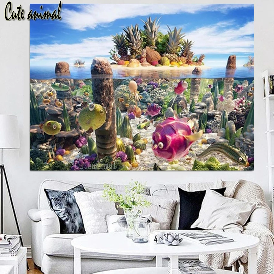 Квадратная Круглая Мозаика 5d, картина из страз с изображением морских рыбок, фруктов, абстрактное искусство, алмазная вышивка, стразы
