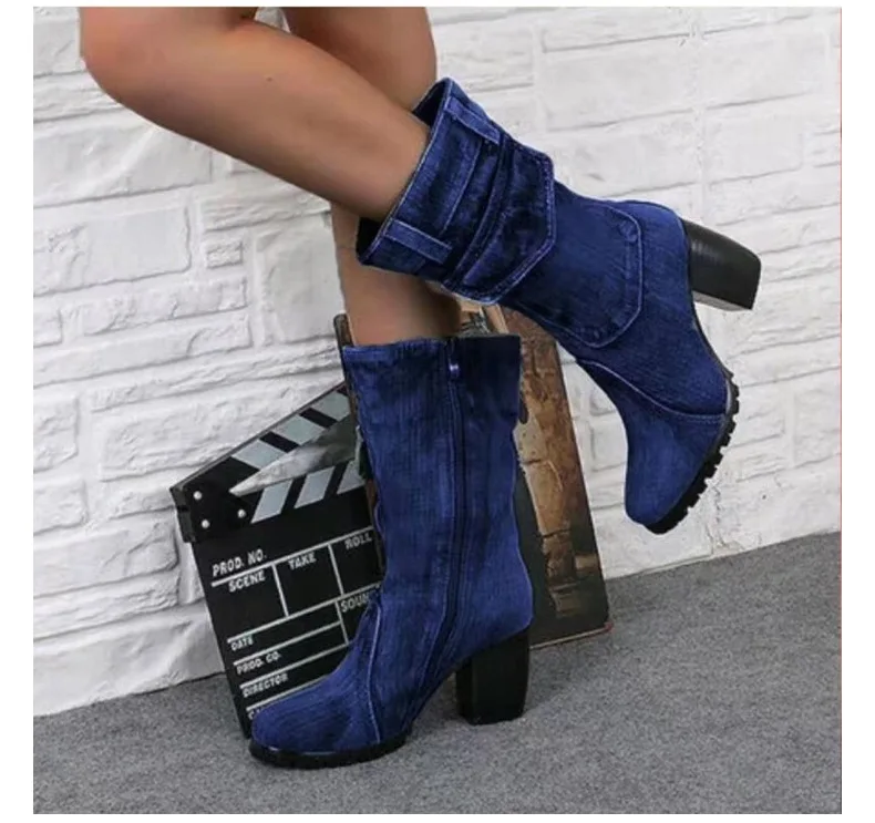 Женские джинсовые ботинки, однотонные ботинки до середины икры, без...