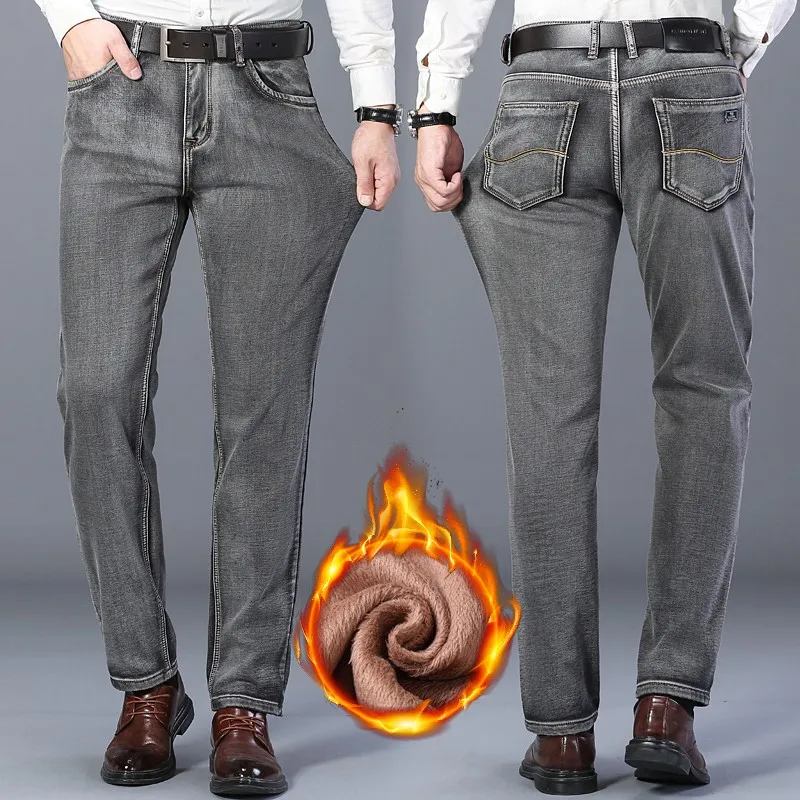 2020 мужские Брендовые брюки, зимние теплые мужские флисовые джинсы, серые хлопковые стандартные эластичные толстые брюки из денима