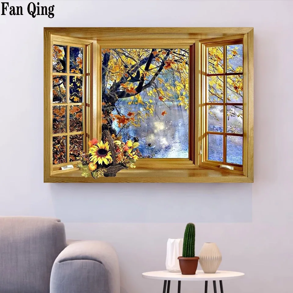 5D Diy алмазная живопись, окно, наружное дерево, озеро, пейзаж, вышивка крестиком, полная квадратная круглая Алмазная вышивка, настенное искусство