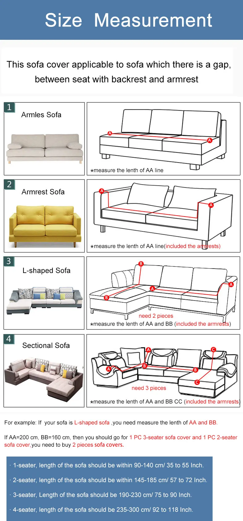 А. Материал: плюшB. Посылка включает в себя: 1 шт. чехол для дивана (продукт-только чехол для дивана, не включая наволочку)C. Размер предполагает:Пожалуйста, измерьте свой диван с подлокотниками, затем выберите размер. Если вы не измеряете подлокотники, чехол для дивана будет меньше, чем ваш диван· 1-местный, длина дивана должна быть в пределах 90-140 см/от 35 до 55 дюймов. · 2-местный, длина дивана должна быть в пределах 145-185 см/57-72 дюйма.· 3-местный, длина дивана должна быть 190-230 см/75-90 дюймов. · 4-местный, длина дивана должна быть 235-300 см/92-118 дюймов.D. Рисунок: однотонный современныйЕ. Обратите внимание:1. Этот чехол для дивана подходит для дивана, который имеет зазор, между сидением со спинкой и подлокотником. (Пожалуйста, убедитесь, что ваш диван имеет глубокий зазор, чтобы выскользнуть пенопластовые стержни перед покупкой.2. Пожалуйста, измерьте свой диван с подлокотником, затем выберите размер, если вы не измерите его, крышка дивана будет меньше, чем ваш диван.3. Допускается погрешность в 1-3 см при ручном измерении, разные страны имеют разный размер, пожалуйста, проверьте его перед покупкой.4. Из-за проблем с транспортировкой на большие расстояния, продукт будет немного складываться, он может быть не таким плоским, как на картинке, но доза не влияет на использование.5. Поскольку разница между различными мониторами, изображение может не отражать фактическийЦвет товара. Мы гарантируем, что рисунок такой же, как на фотографиях.F. Легкий вес и простота в уходе: легко установить и забрать; Машинная стирка в холодной воде, не отбеливать, сушить в стиральной машине, не гладить, шаги по установке показаны на изображении