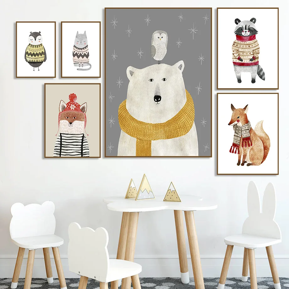 Мультяшный медведь лиса Сова олень собака Кот енот Картина на холсте в скандинавском стиле плакаты и принты настенные картины для декора детской комнаты