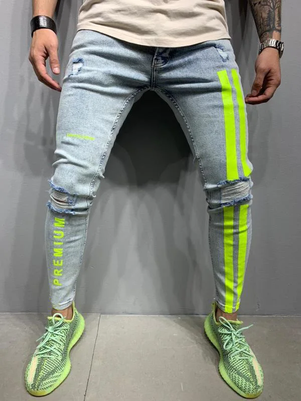 Джинсы-Карандаш мужские рваные, байкерские облегающие брюки в полоску сбоку, с дырками, стиль хип-хоп