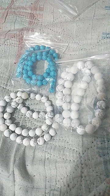 Отличные бусы. Полностью соответствуют описанию и заявленному фото. Заказывала 2 снизки диаметром 4 мм, размер совпадает, практически все бусины ровные. В снизках пришло 94 и 95 штук вместо заявленных 92, за что продавцу отдельное спасибо. Цвет небесно-лазоревый, ярко-бирюзовый, как у аризонской бирюзы, только с черно-серыми прожилками. Блеск ближе к стеклянному, как если бы покрыты были лаком. Несколько бусин склеены между собой, но резаком легко отделились. Не пачкают. В месте отверстия цвет ровный. Возможно, крашеные, но тогда прокрашены хорошо, без непрокраса и белых пятен. На ощупь холодные, тяжелые, похоже настоящий камень. Конечно, не натуральная бирюза за такие деньги. Но как имитация они шикарны. Покупкой довольна, продавца рекомендую.