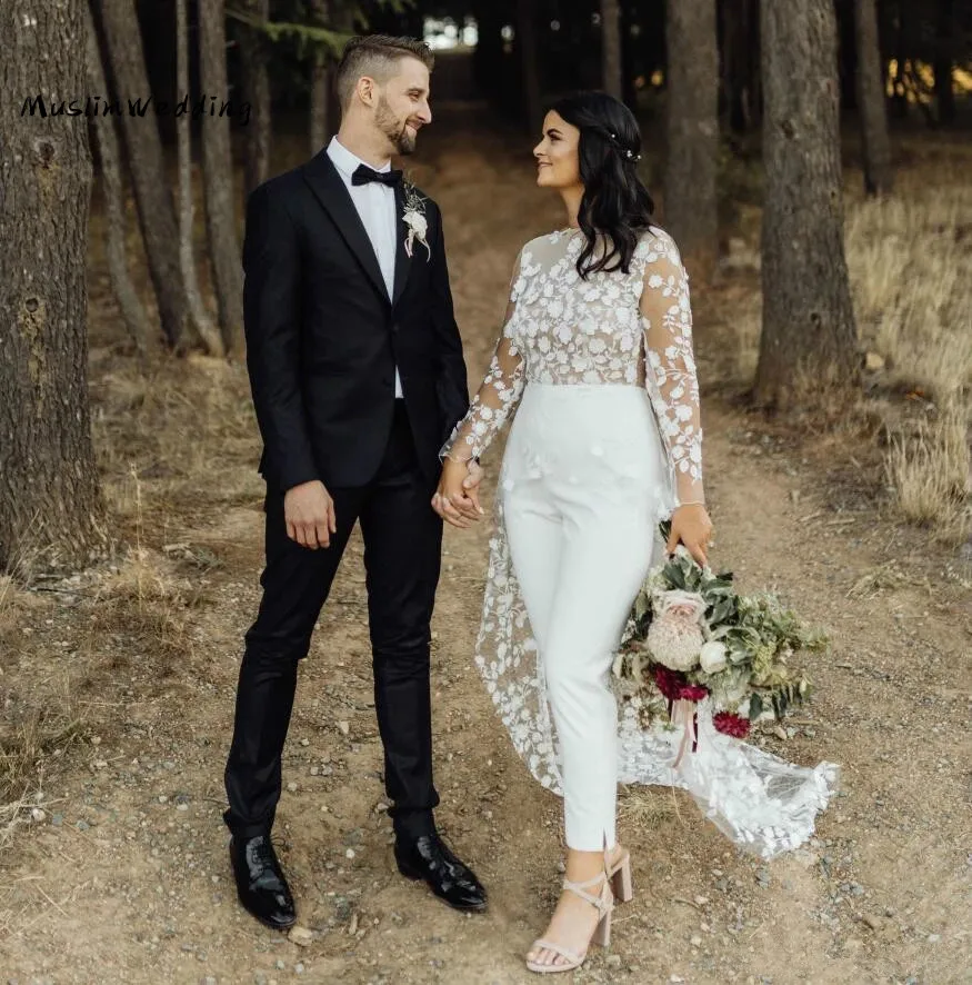 Женское свадебное платье-комбинезон в стиле бохо 2020 с кружевным шлейфом, недорогие штаны, праздничные богемные Свадебные платья с длинным рукавом для невесты
