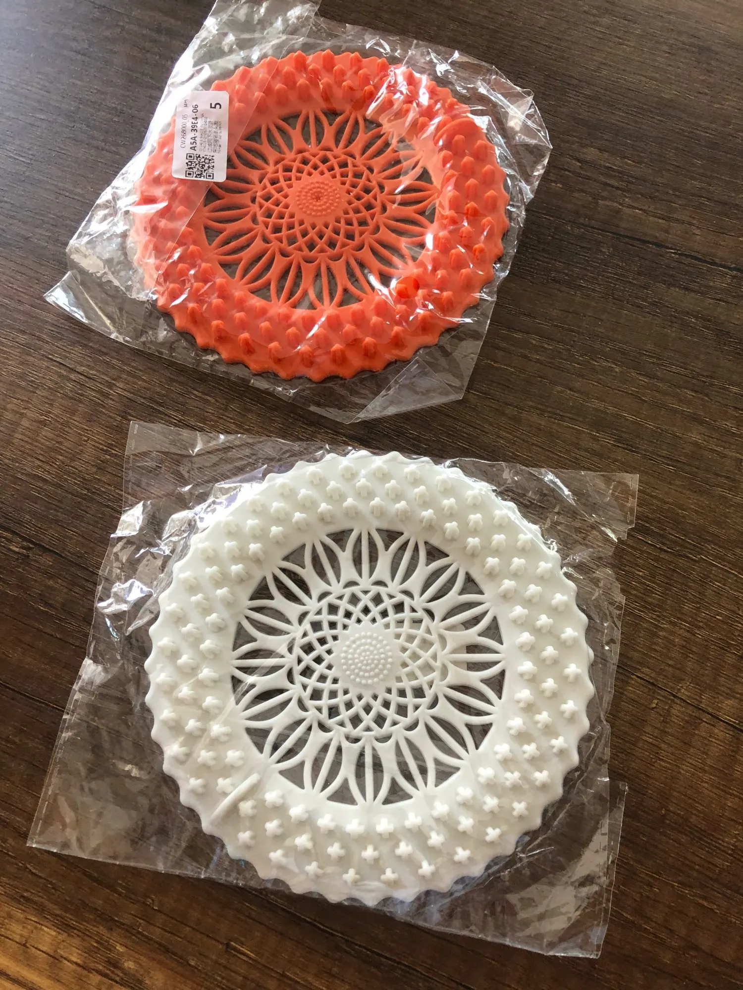 Очень быстро доставили. Цена самая низкая на сайте, а товар качественный. Плотная резина, хорошо прилегает к плоскому полу душа. Присосок нет. Хорошо задерживает волосы. Рекомендую.