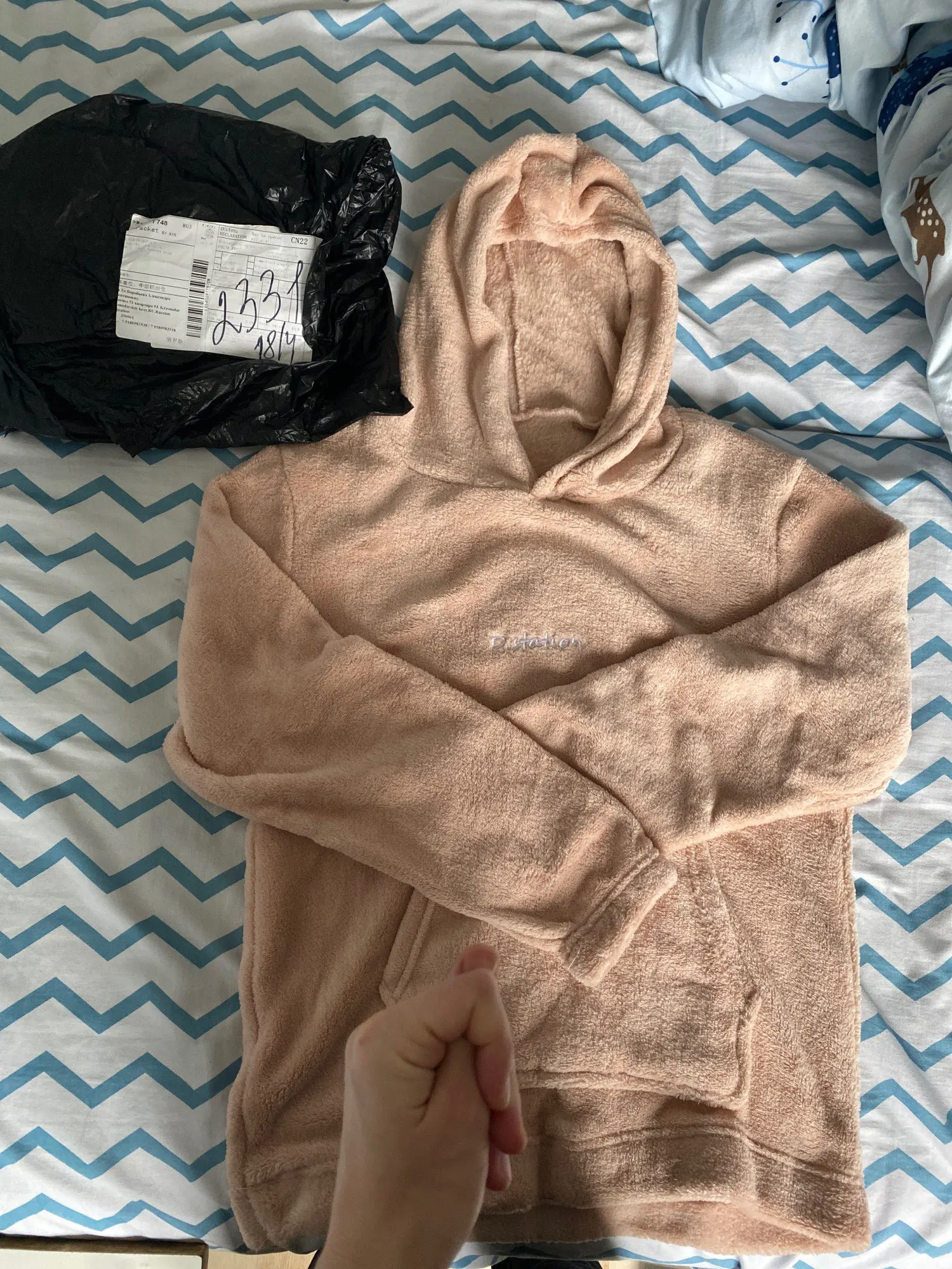 Доставка месяц. Мягкая кофта, приятная. Размер на 44 нормально, но не оверсайз. Расстроило что сильно сыпятся ворсинки и липнут к одежде.