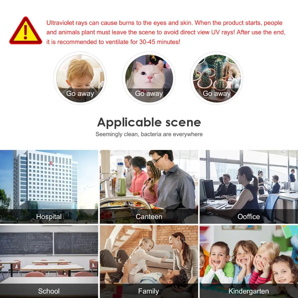 Лучи UVC вредны для глаз и кожи, не смотрите на лампу, когда светильник. Люди/Домашние животные/растения не могут подвергаться воздействию светильник. После использования, так как лампа убила много бактерий в комнате, Откройте окна и двери, дайте комнате проветриваться 15 минут, затем войдите.