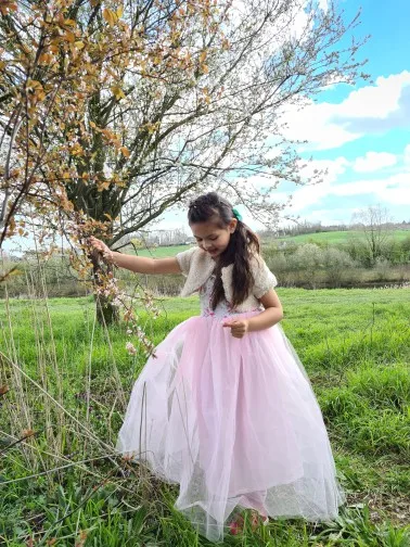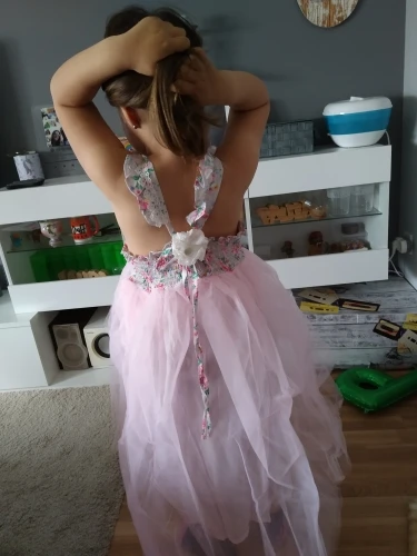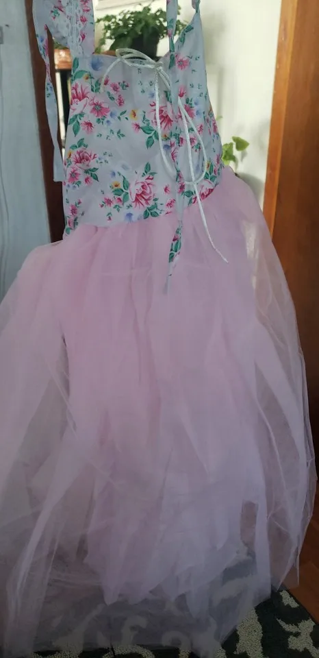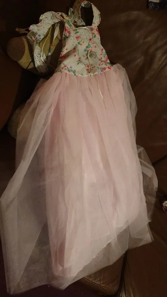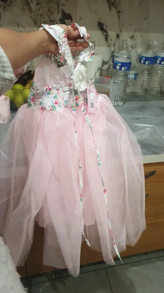 Очень милое платье, тюль менее пышный, но все равно очень нравится. Действительно стоит того. Быстрая доставка. У меня был размер 140, моему ребенку 6 лет и немного меньше.