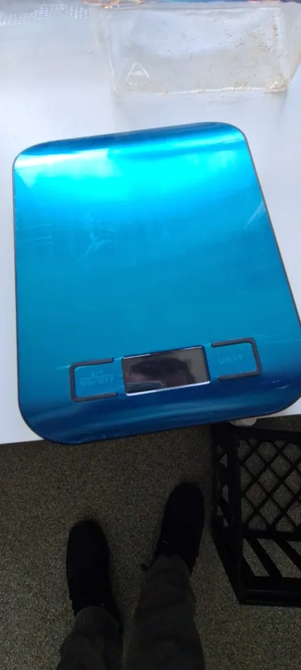 Он только что прибыл, и вам нужно будет 2 AAA батареи, и работает идеально. Хороший прозрачный светодиодный дисплей. Единицы измерения могут переключаться между граммами, унциями и мл. Мне нужно это для выпечки. Я надел там ручку для справки по размерам. Около 1/2 размера моего планшета Samsung TAB A7. Это 10 дюймов. На нем все еще есть зеленая защитная пленка, но под ней стальная отделка. Очень хорошо
