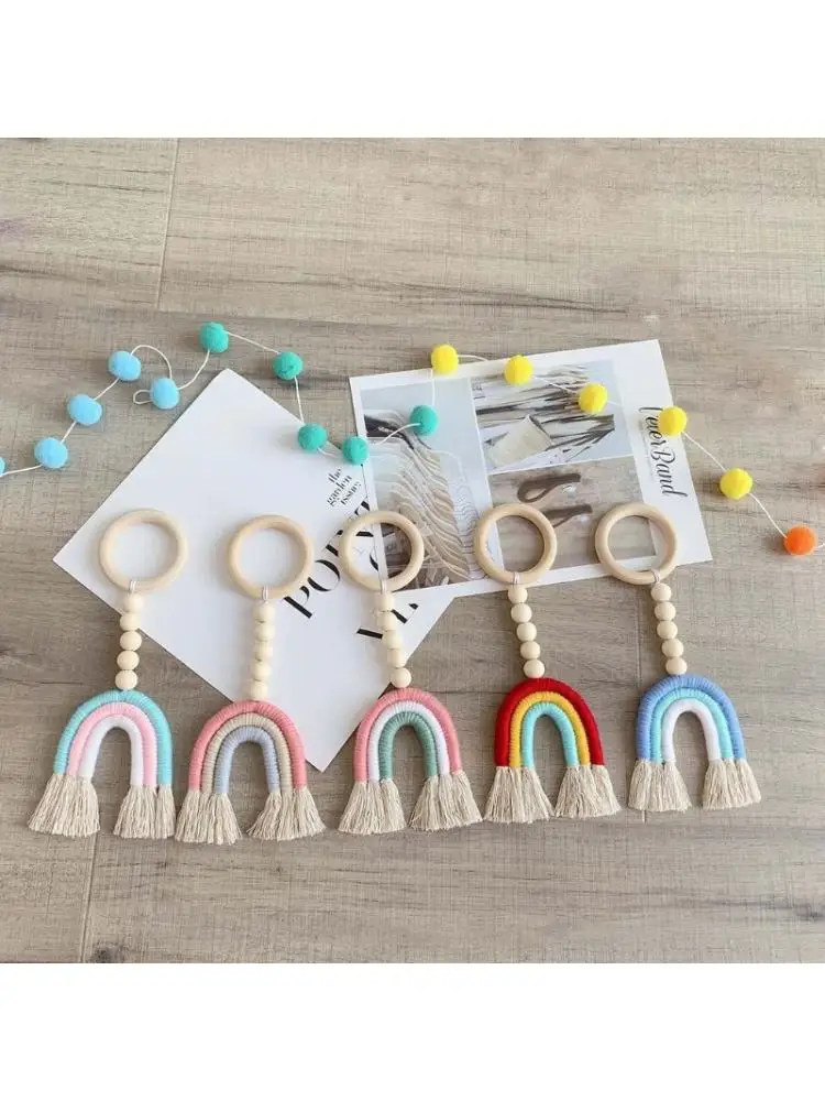 Детское кольцо для прорезывания зубов с радужной кисточкой и деревянными бусинами