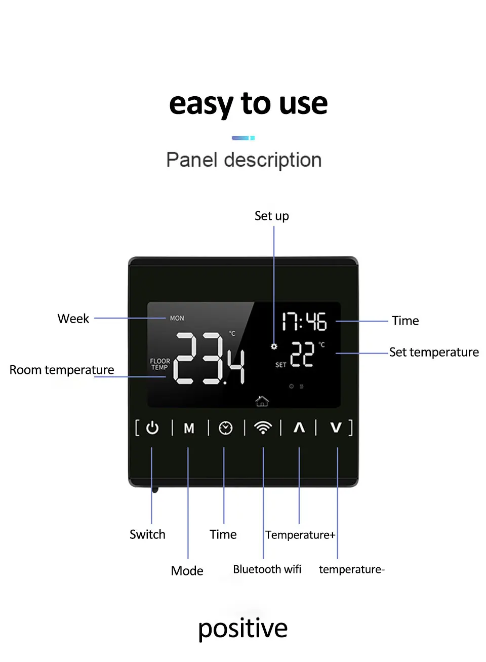 Термостат подходит для нагревательного кабеля, нагревательного коврика, нагревательной пленки и других устройств электрического нагрева.