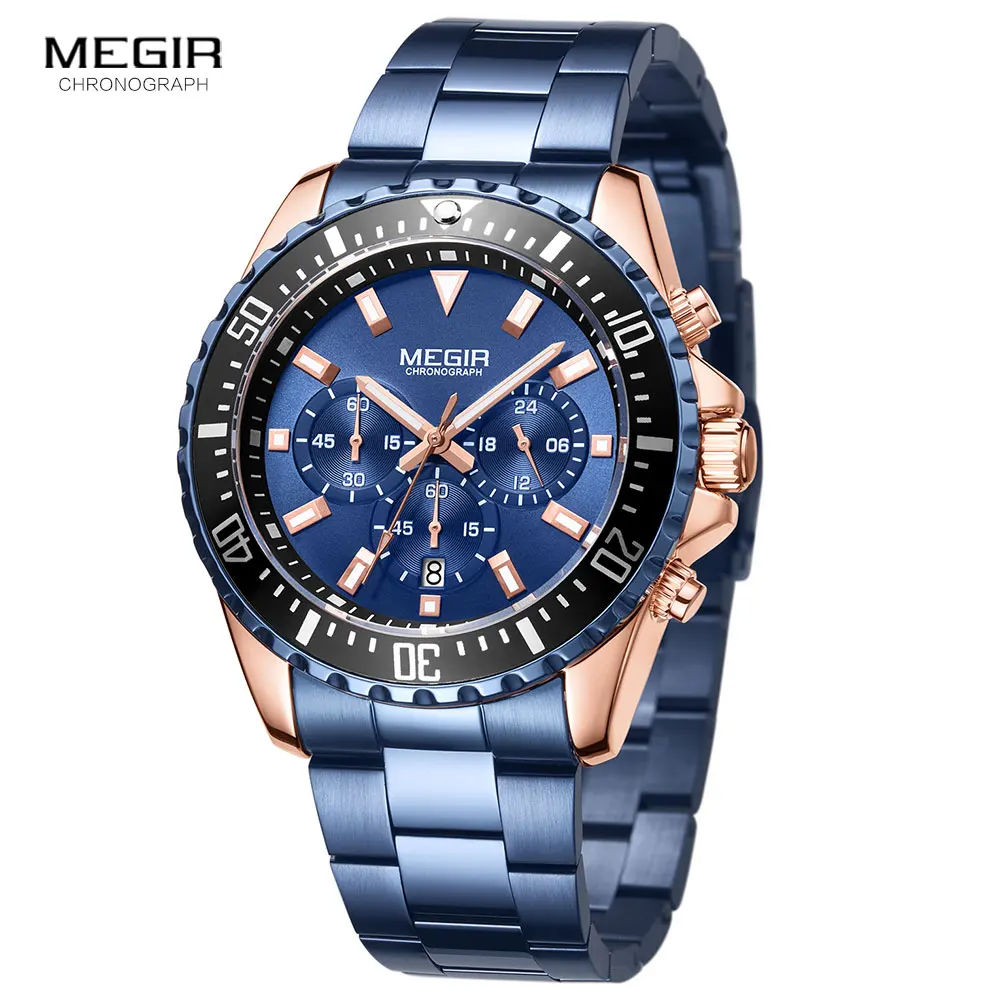Часы MEGIR мужские кварцевые с хронографом, светящиеся синие наручн...