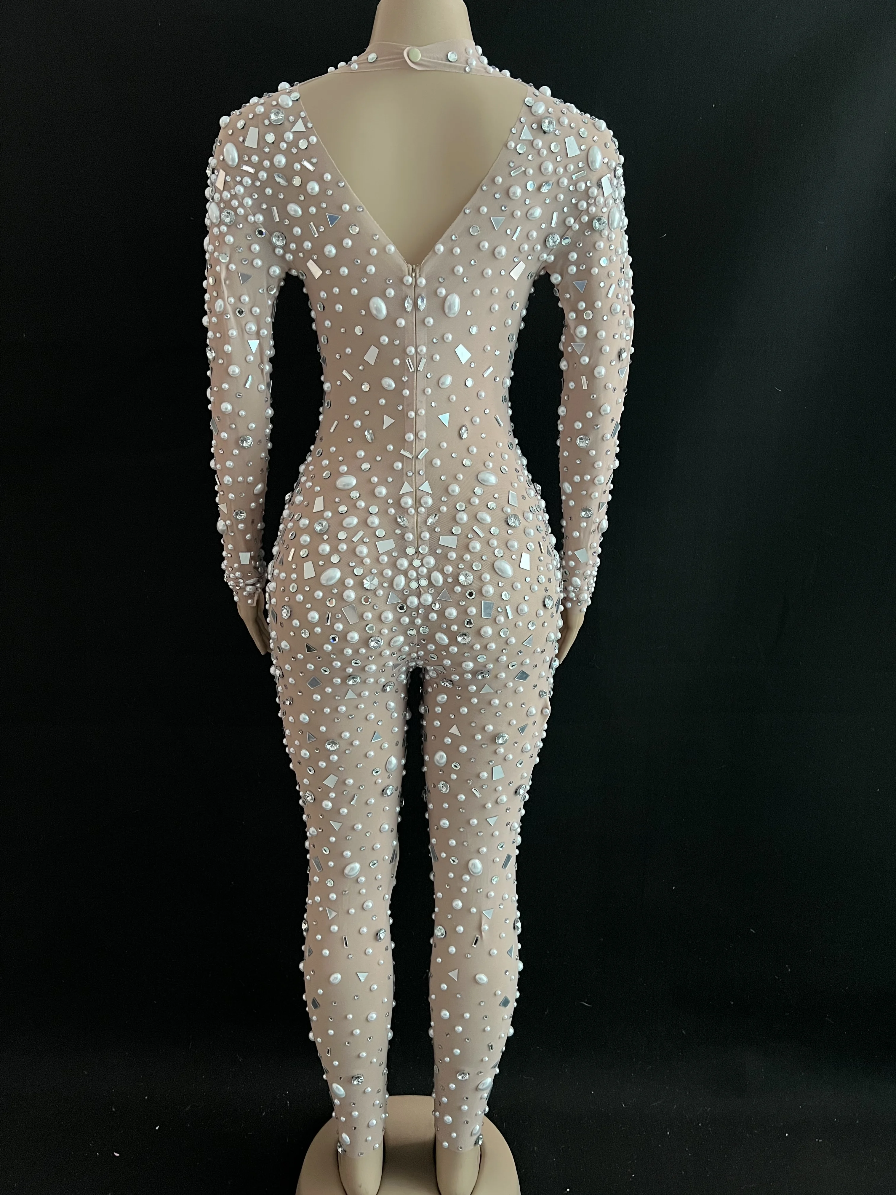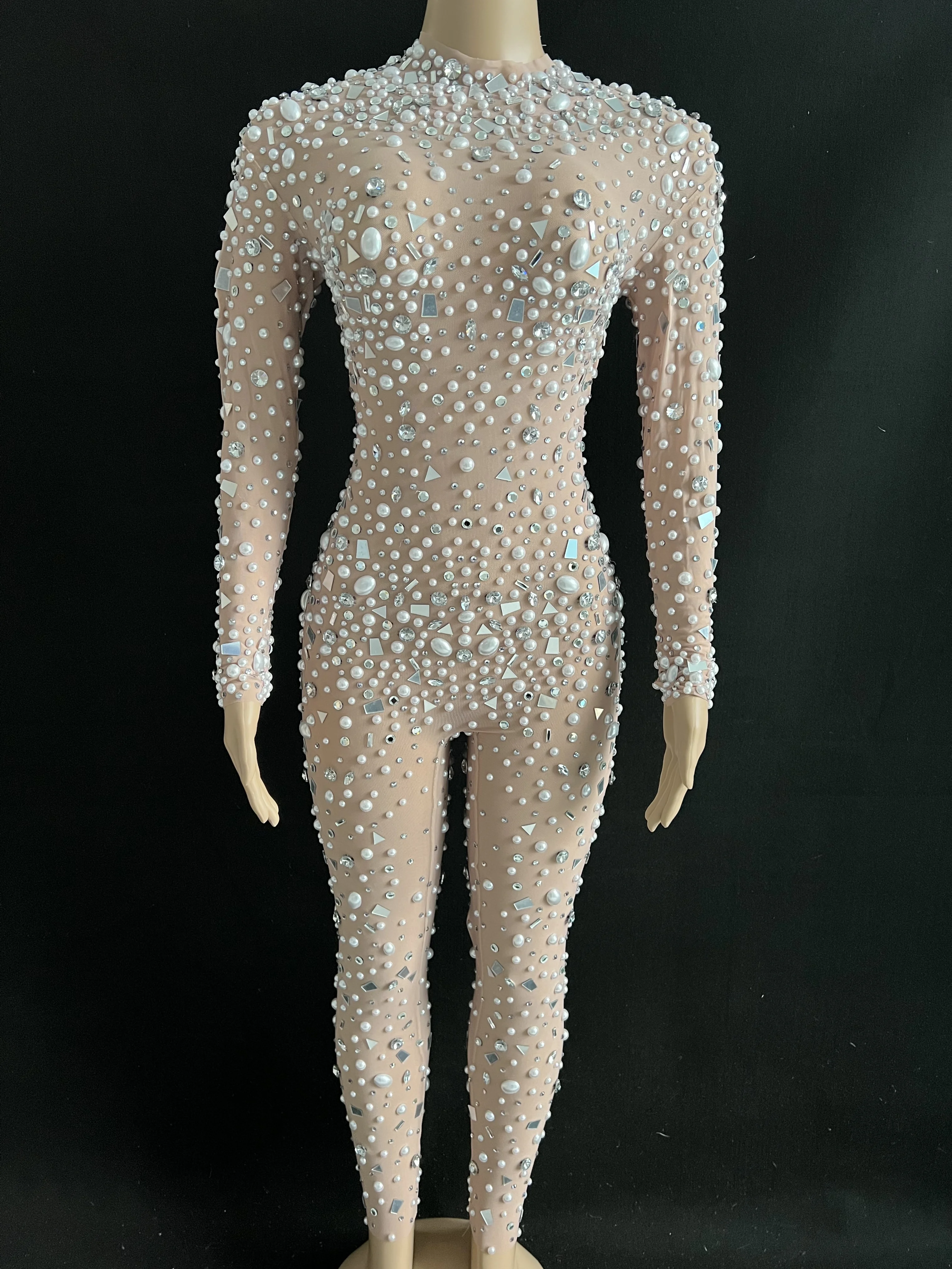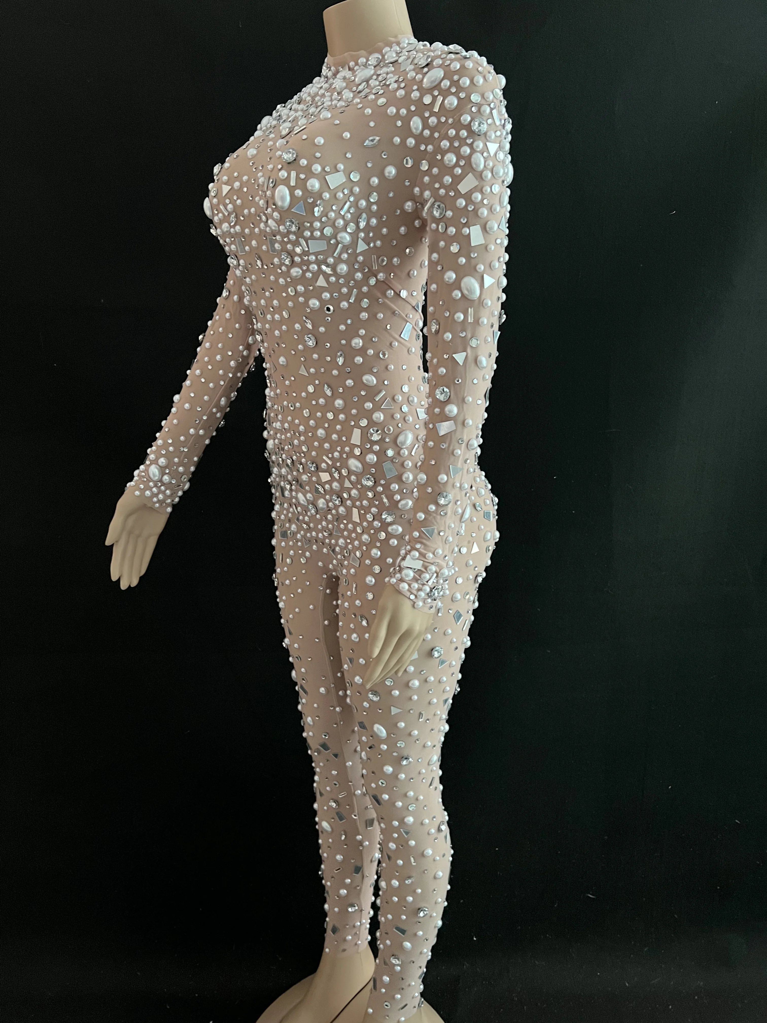 Роскошный прозрачный комбинезон с жемчугом и зеркалами, Женский веч...