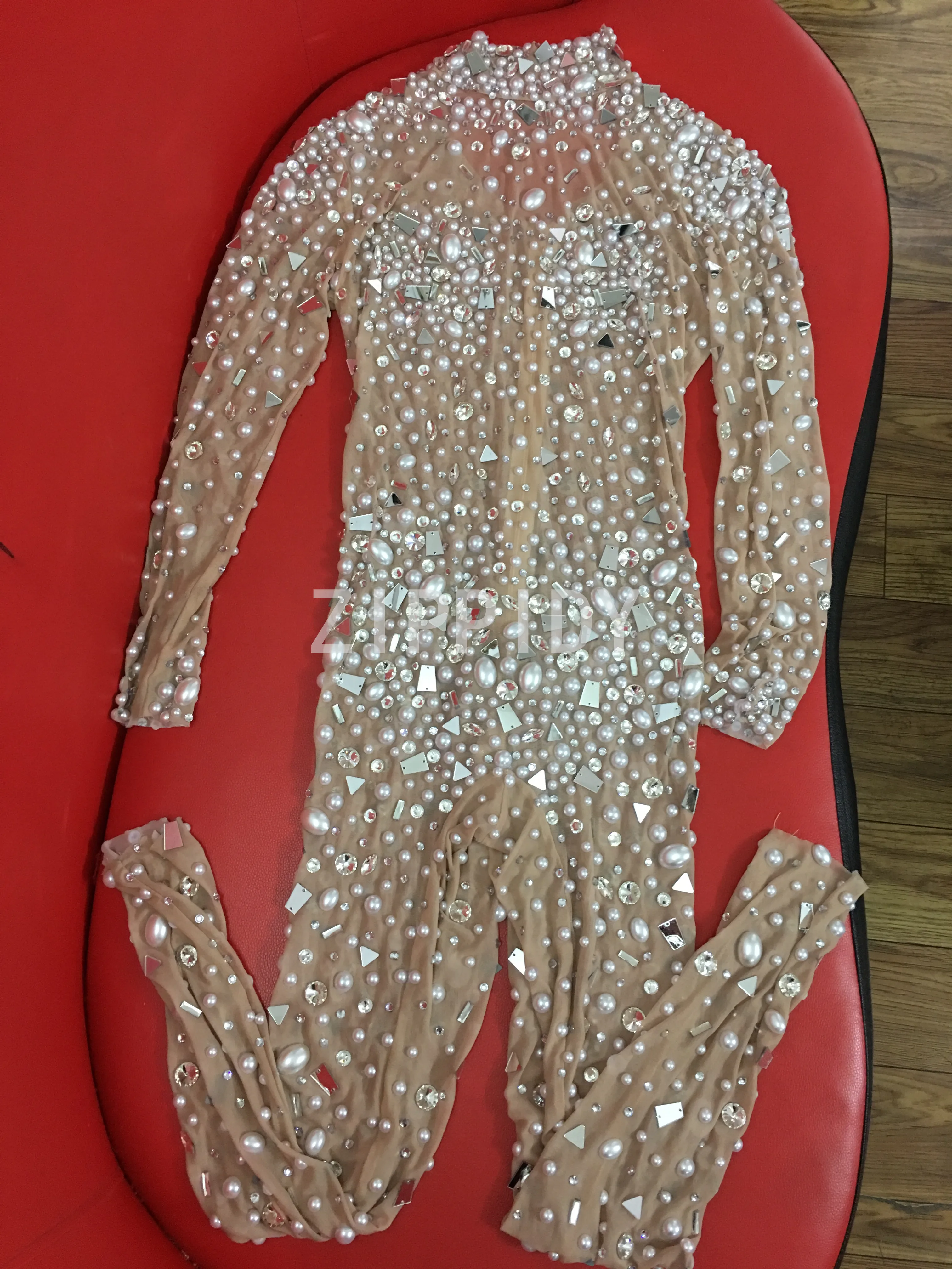 Сексуальный сценический комбинезон серебряное зеркало стразы жемчуж...