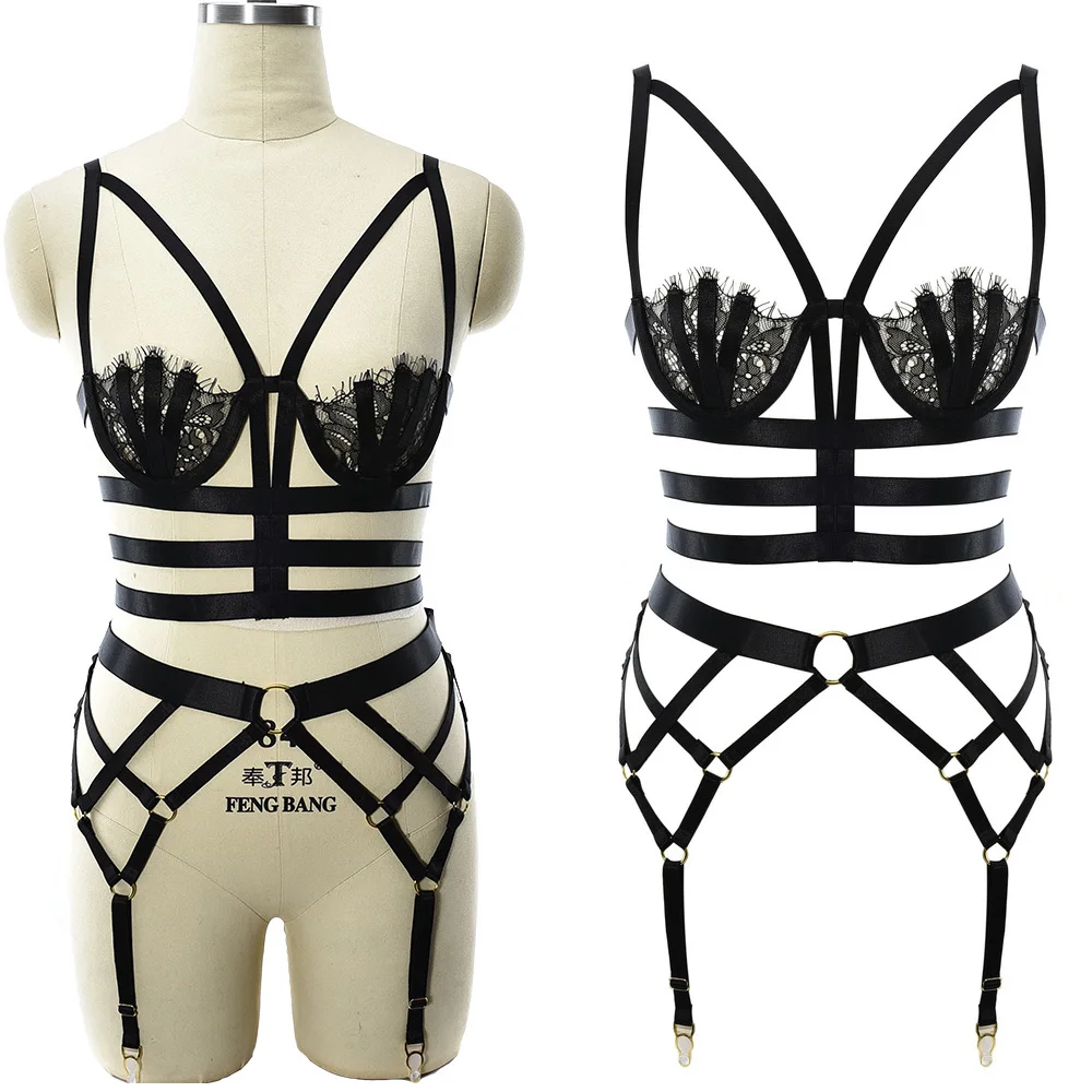 Сексуальное боди, Женское боди с ремнями, кружевной бюстгальтер без косточек, женское бондажное белье, чулки, подвязка, ажурная боди-клетка