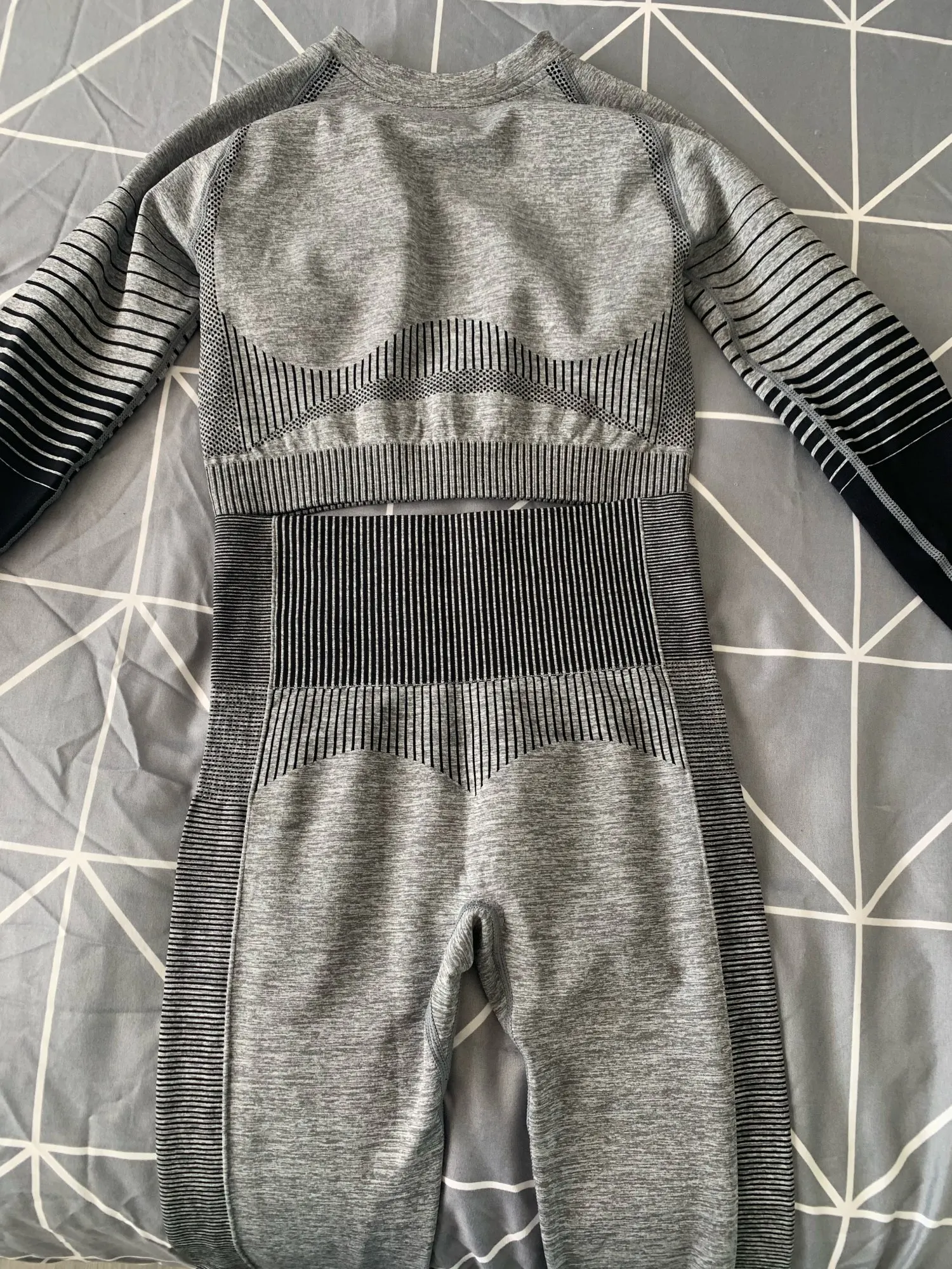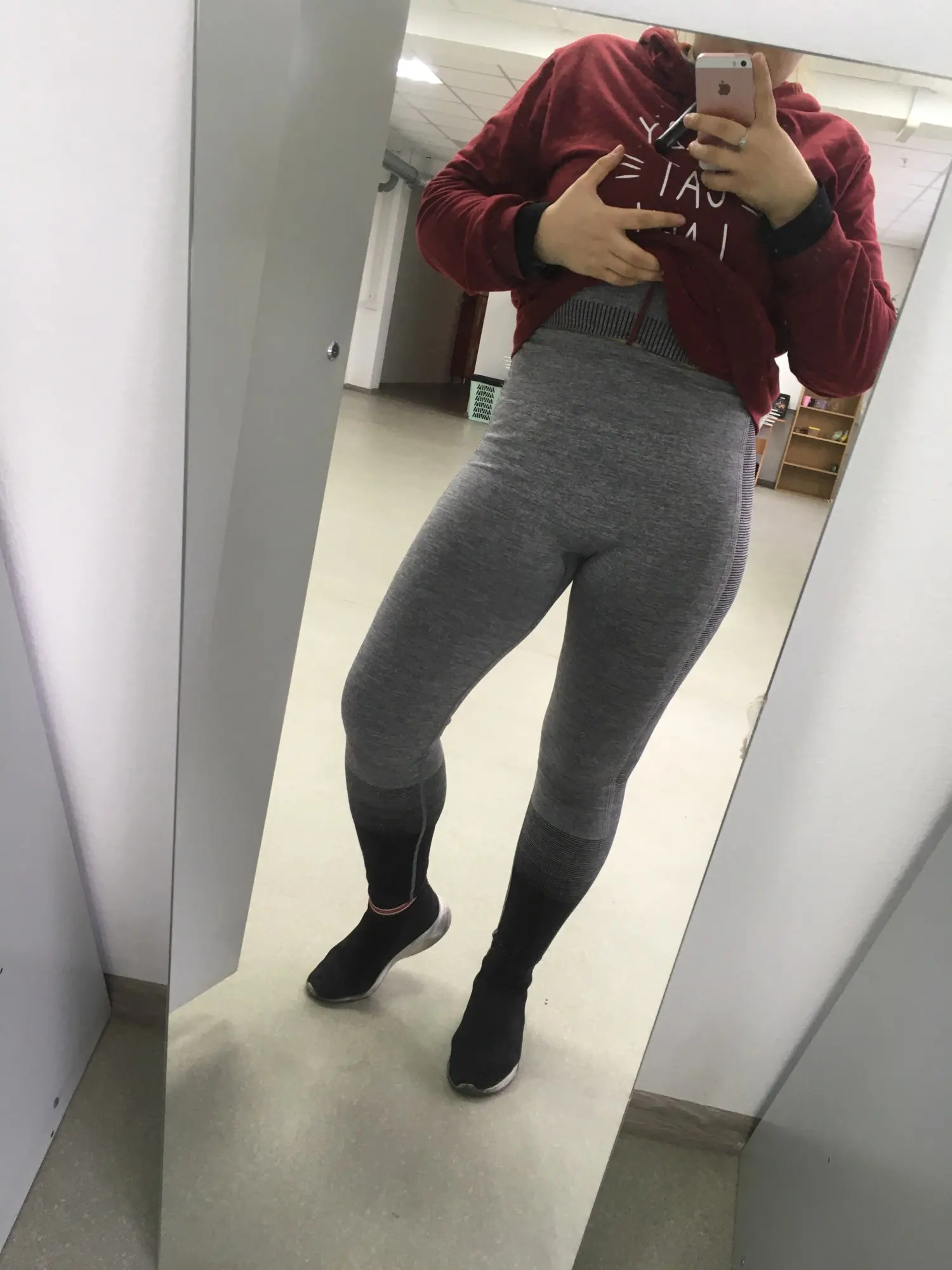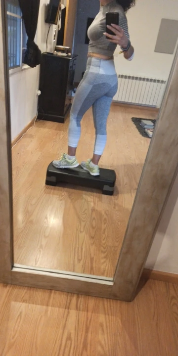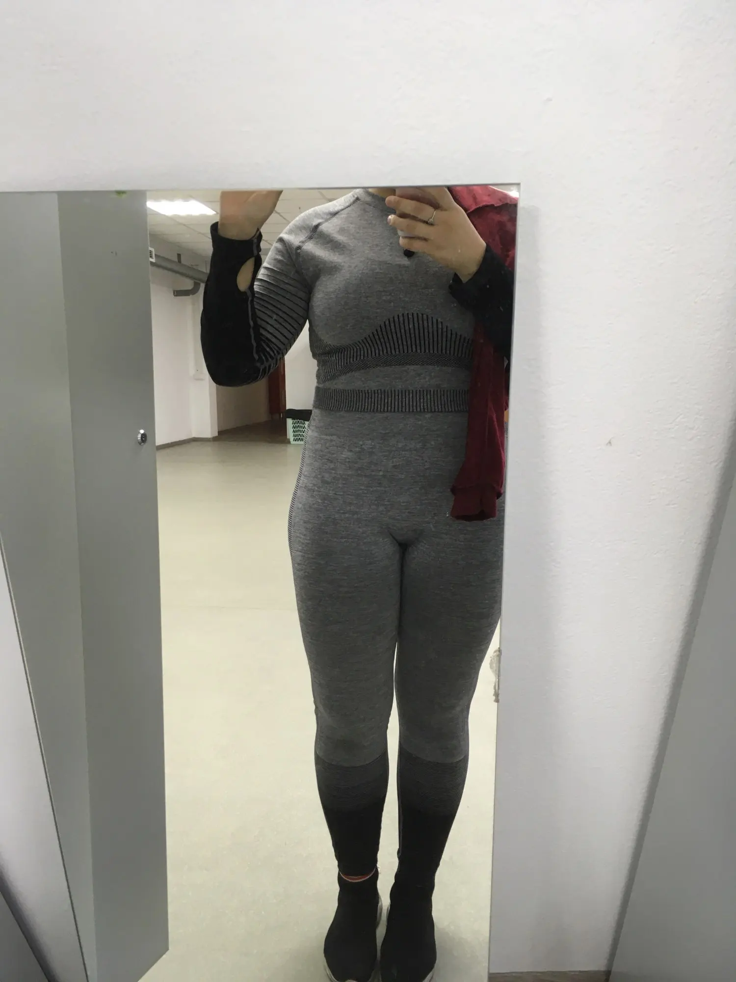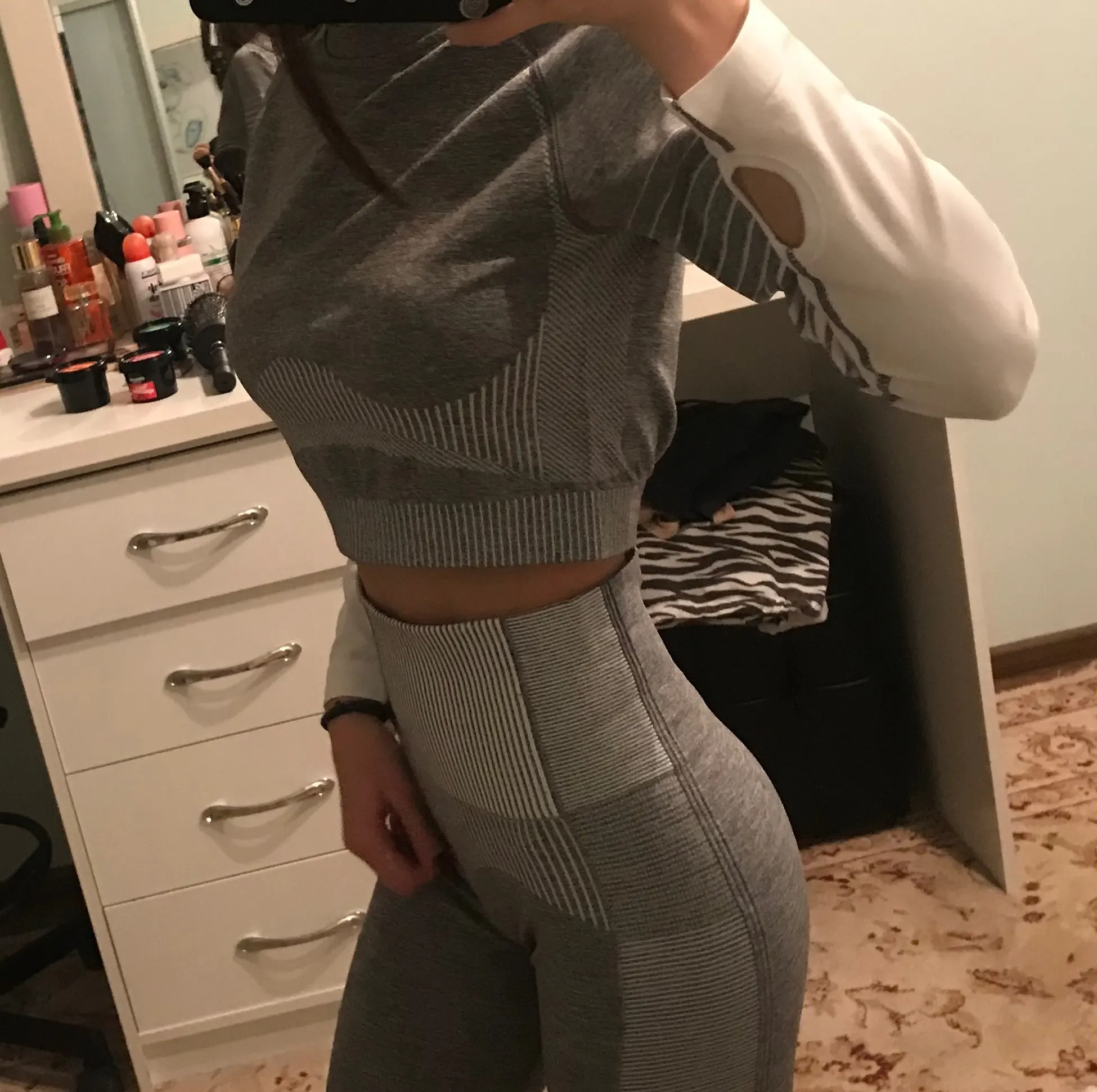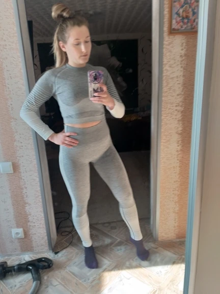 Топ свободный оказался. Но в рукавах маленький. Очень странно. Лосины как раз. Комфортно в них, не скрывают движения. Полоски, которые на попе на мой взгляд зрительно попу уменьшают ♀️