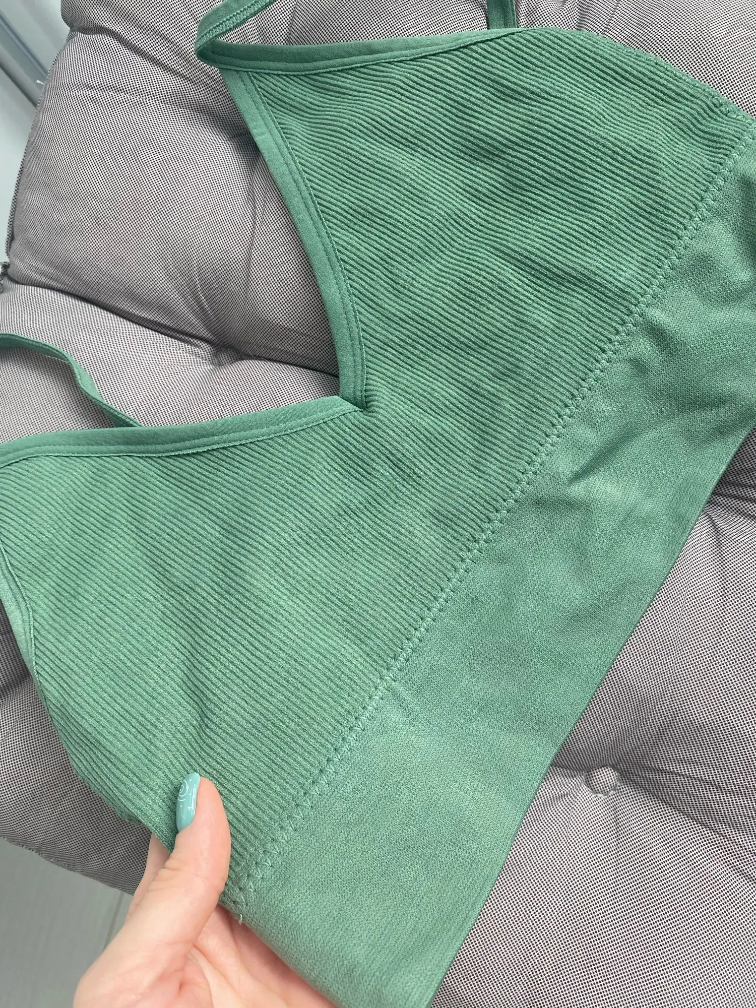 Топ классный. Очень понравился цвет. Размер М на параметры тела 82-60-89 сел хорошо, даже довольно свободно. Чашки не очень удобные из-за утолщения снизу. Вставила другие. Трусики не удобные для меня. Ткань очень мягкая и растяжимая. На резинке топа есть небольшие зацепки, но это мелочи.