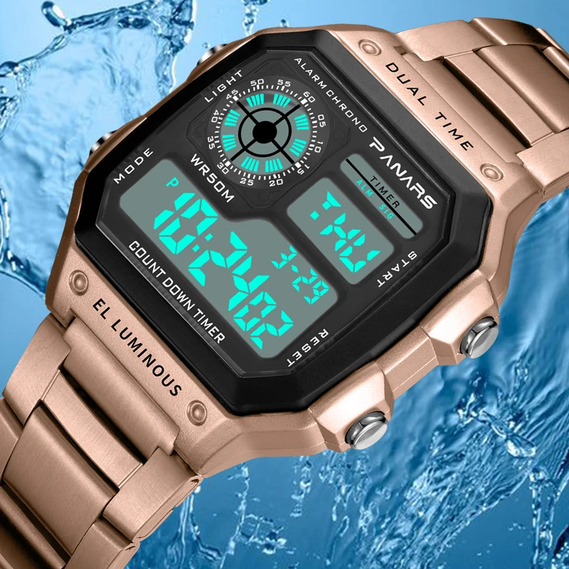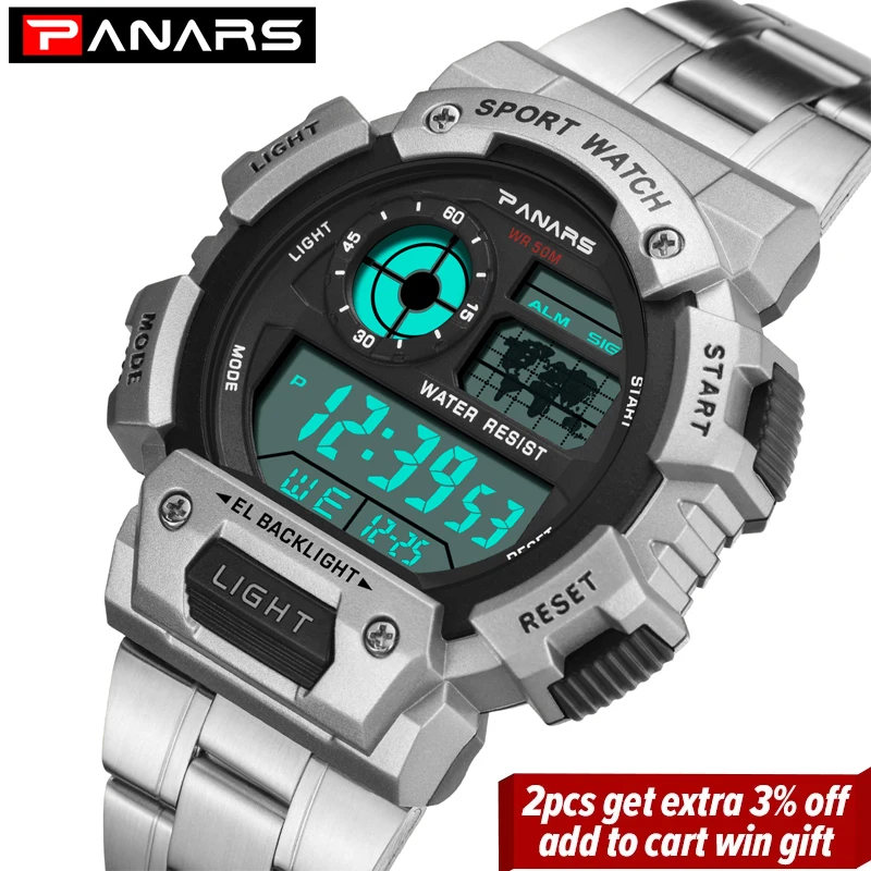 Диаметр часов: маленькие часы (женские): 36,8 мм; Большие часы (мужские): 44 ммPANARS спортивные мужские часы Военные стальные Электронные цифровые наручные часы водонепроницаемые Отображение Даты Недели будильник Horloges Mannen