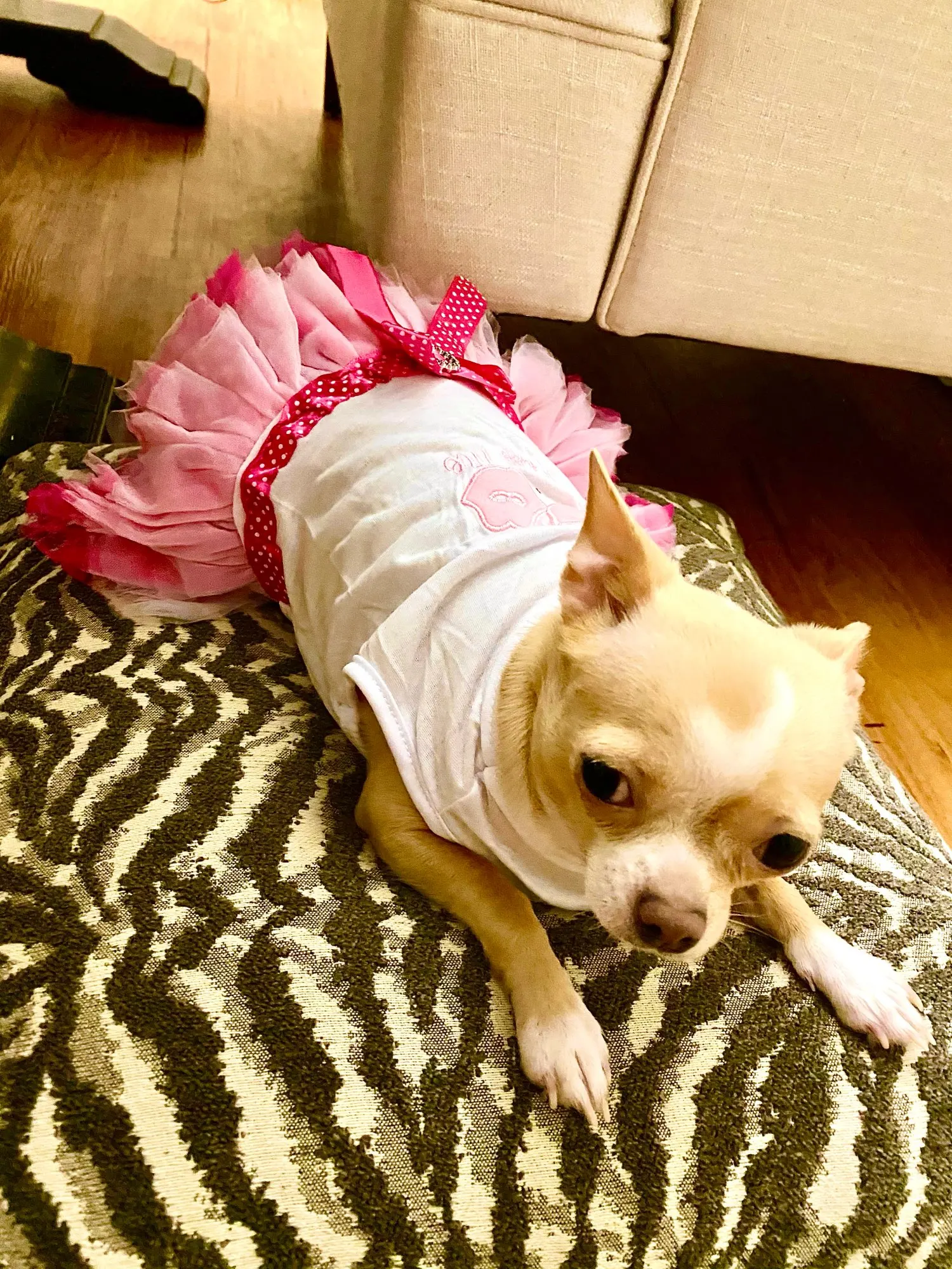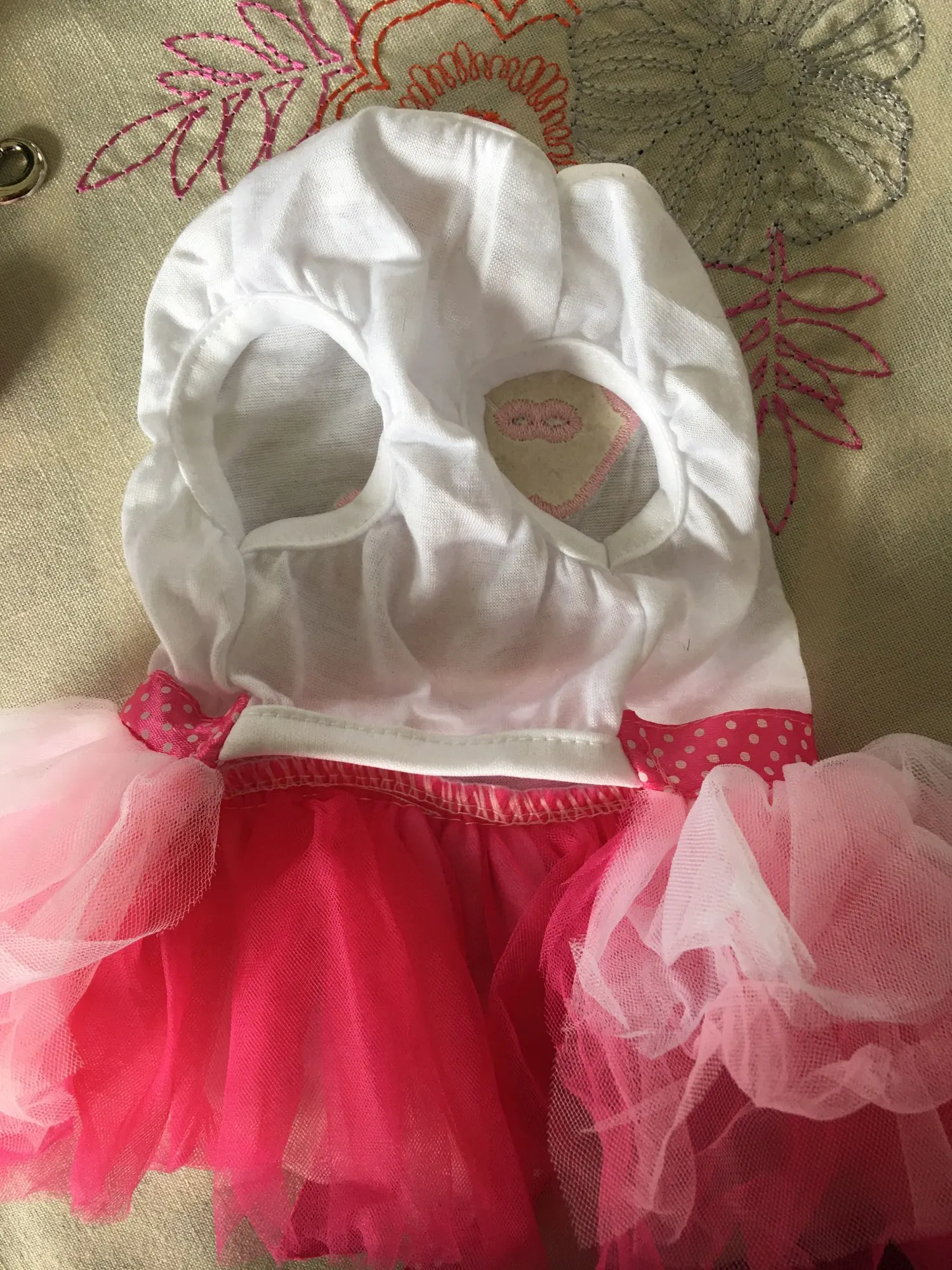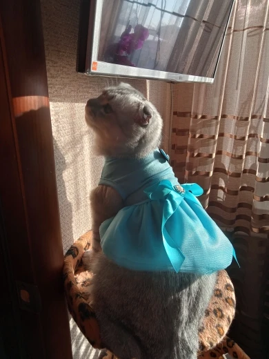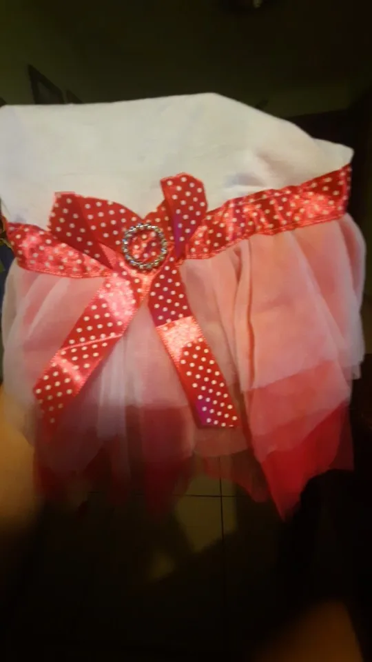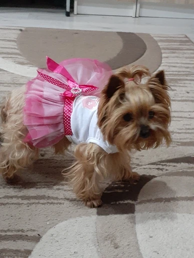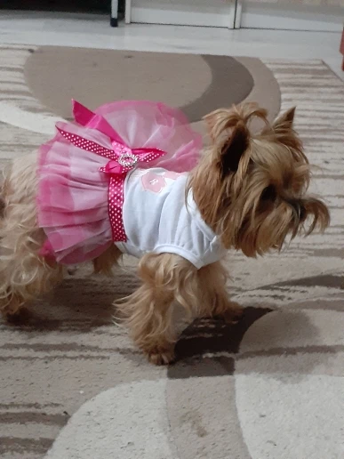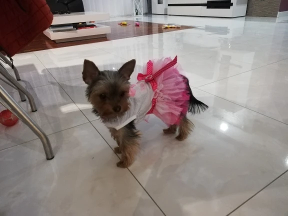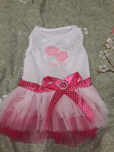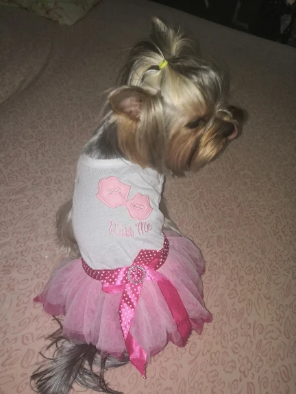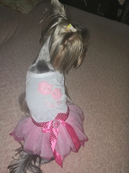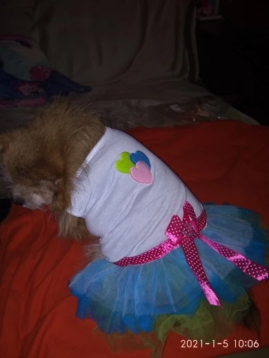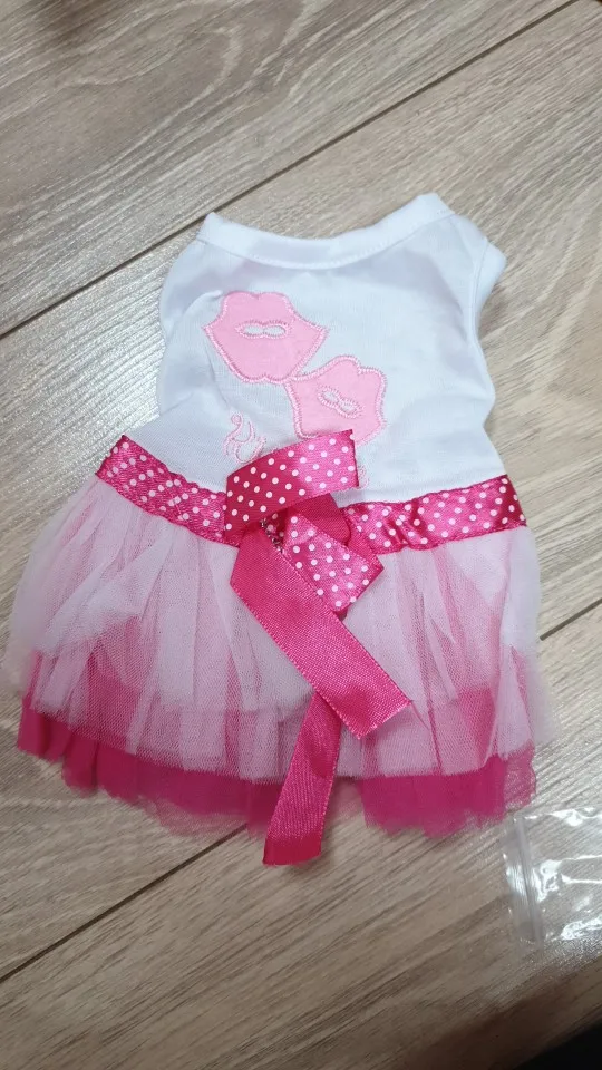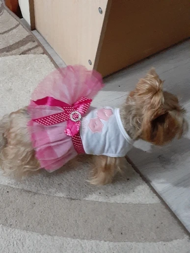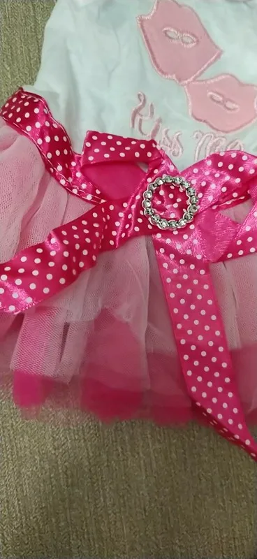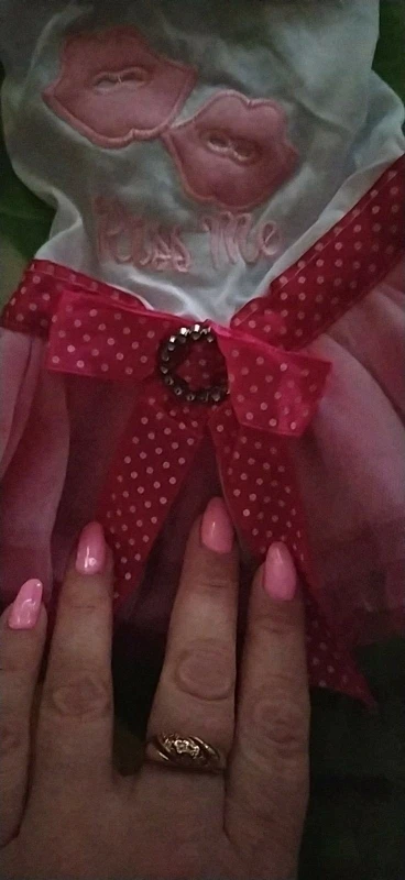 29 дней до Воронежа.Юбка не имеет такой пышности, как заявлено продавцом. Зачем тут фотография одна, а на самом деле платье совсем другое.Бантик наклеен криво. Неужели не видно, куда вы его клеяли? Собачке пока платье велико. Но все равно она в нём такая забавная.На фото видно стремный бант. Он не мятый, он так криво преклеен.