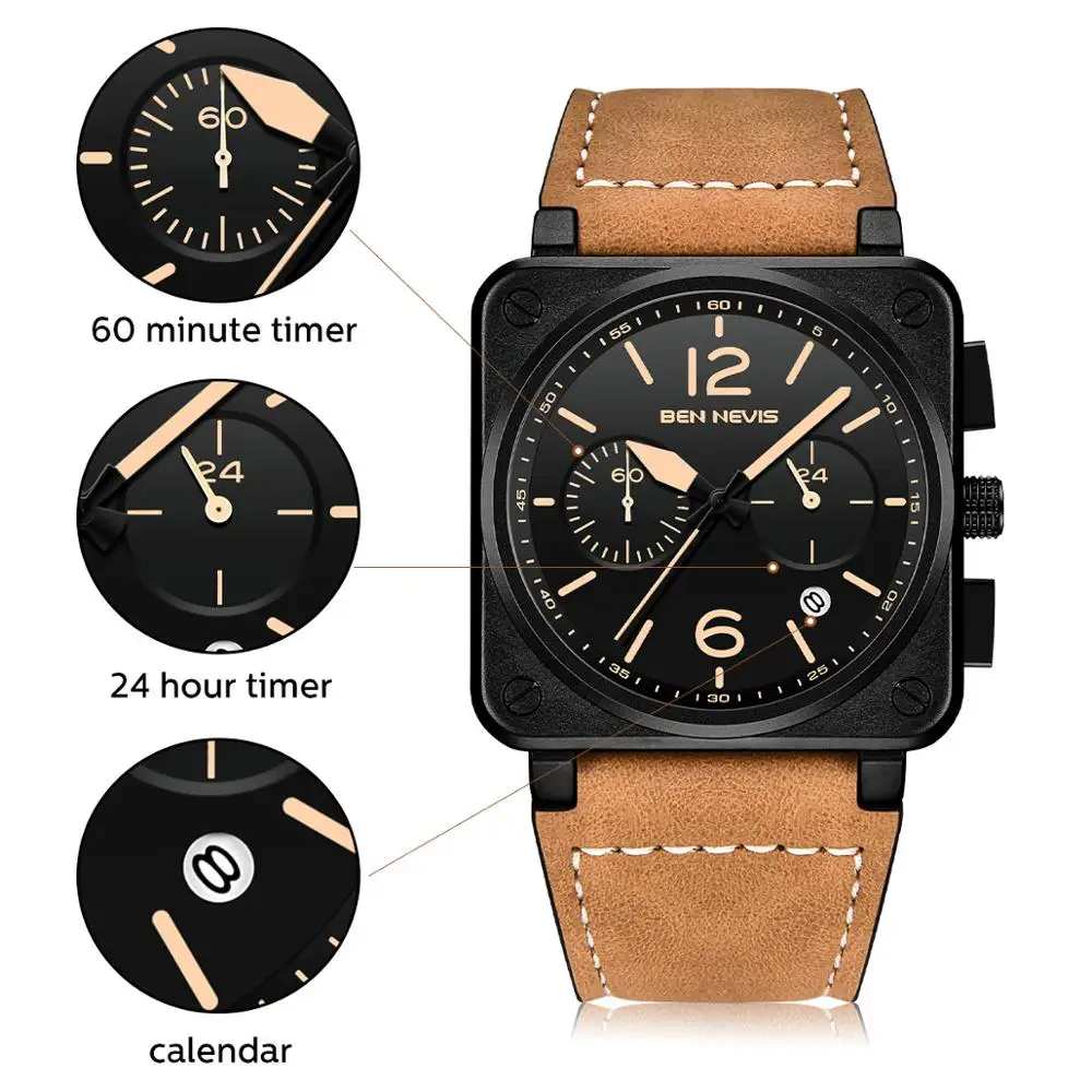 Военные часы мужские кожаные черные квадратные мужские кварцевые наручные часы бренд BEN NEVIS уникальные мужские часы 2020 современный Montre Homme