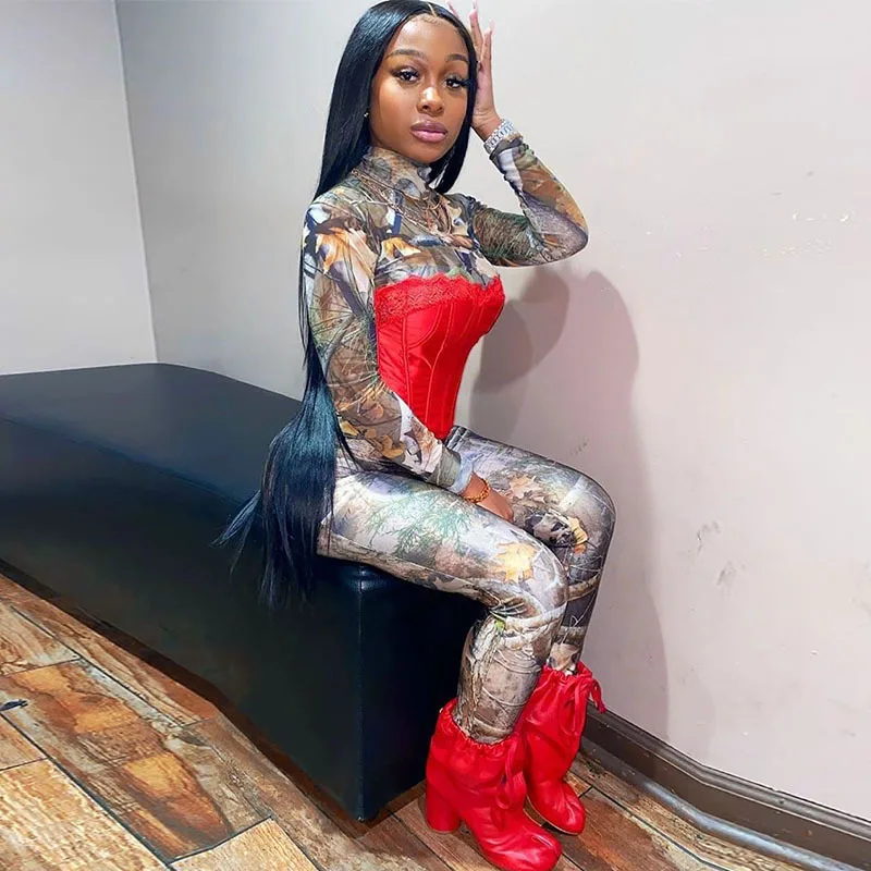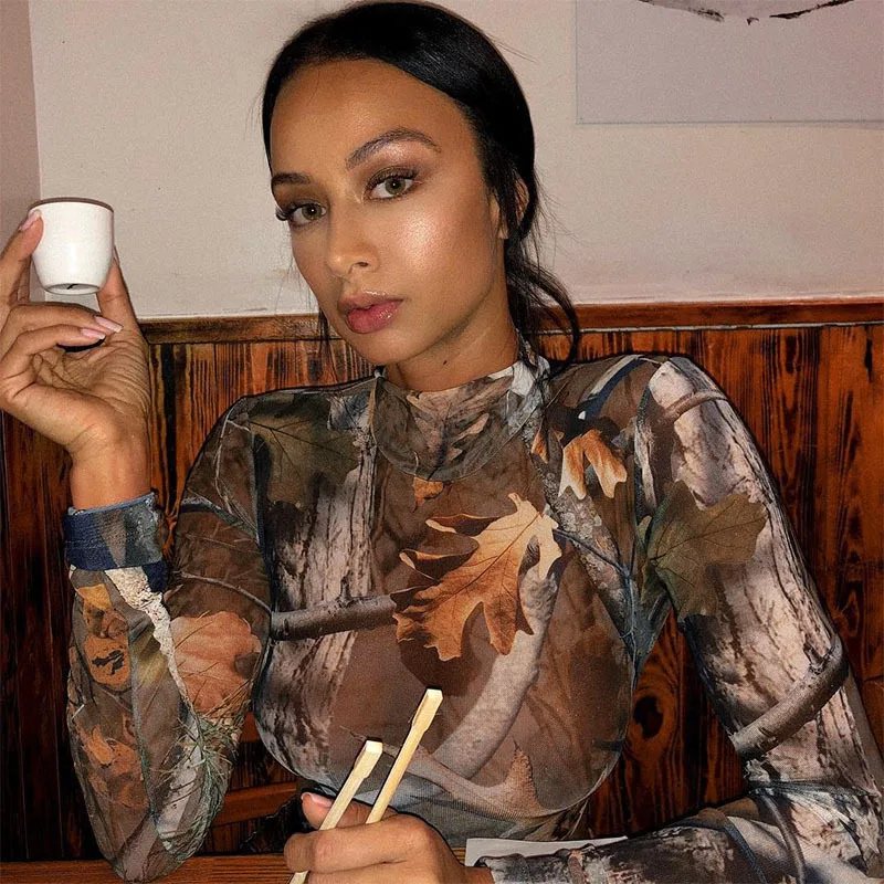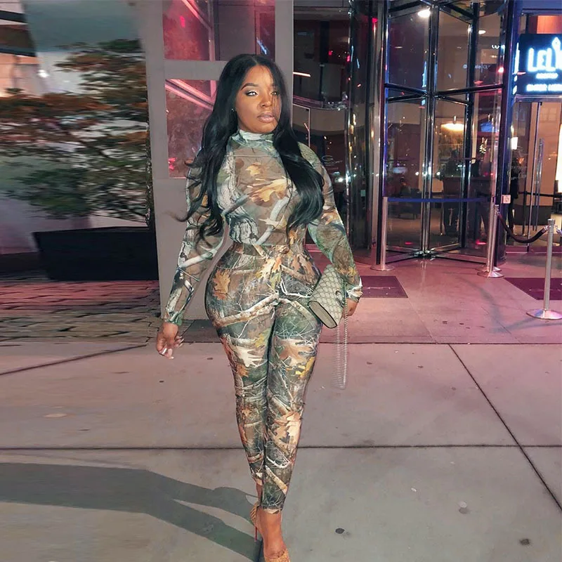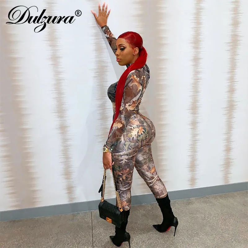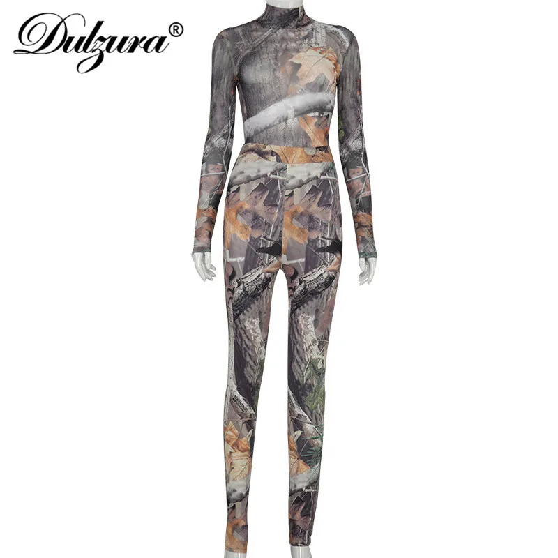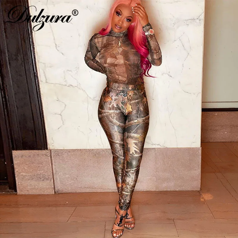Женский комплект из двух предметов с принтом листьев Dulzura, сетчатый боди с длинными рукавами, леггинсы, облегающая Сексуальная уличная одежда, осень-зима 2020