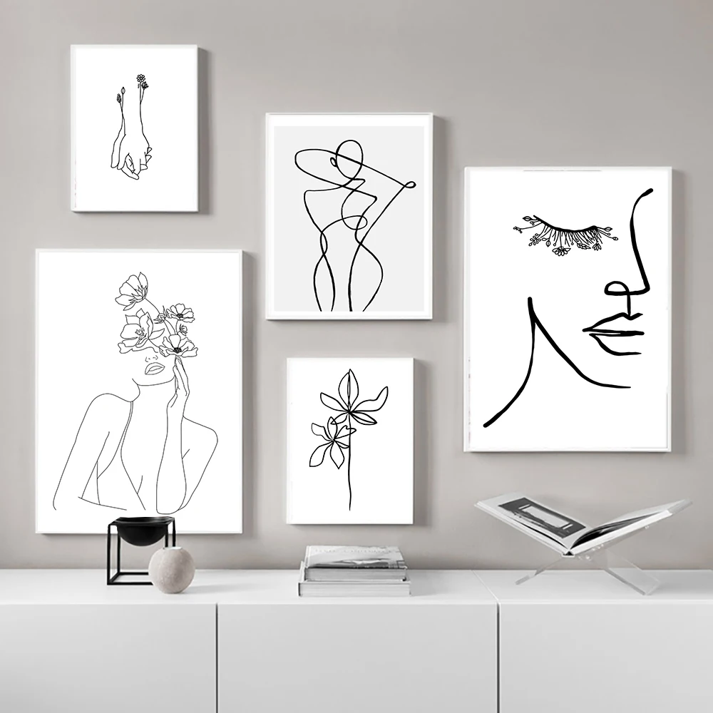 Настенный художественный Рисунок, рисунок для девочек, минималистичный Простой Модный плакат для женщин, цветок, лист, рука, тело, эскиз, черная, белая Картина на холсте