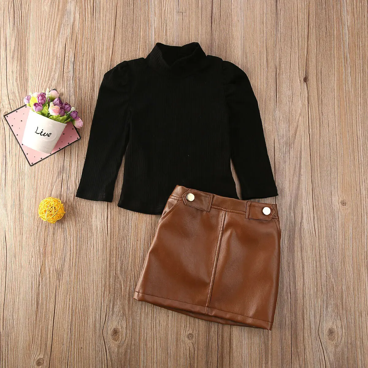 Весенний костюм из 2 предметов, свитер Топы + юбка из искусственной кожи детские комплекты Одежда для девочек модный комплект одежды для девочек, детская одежда
