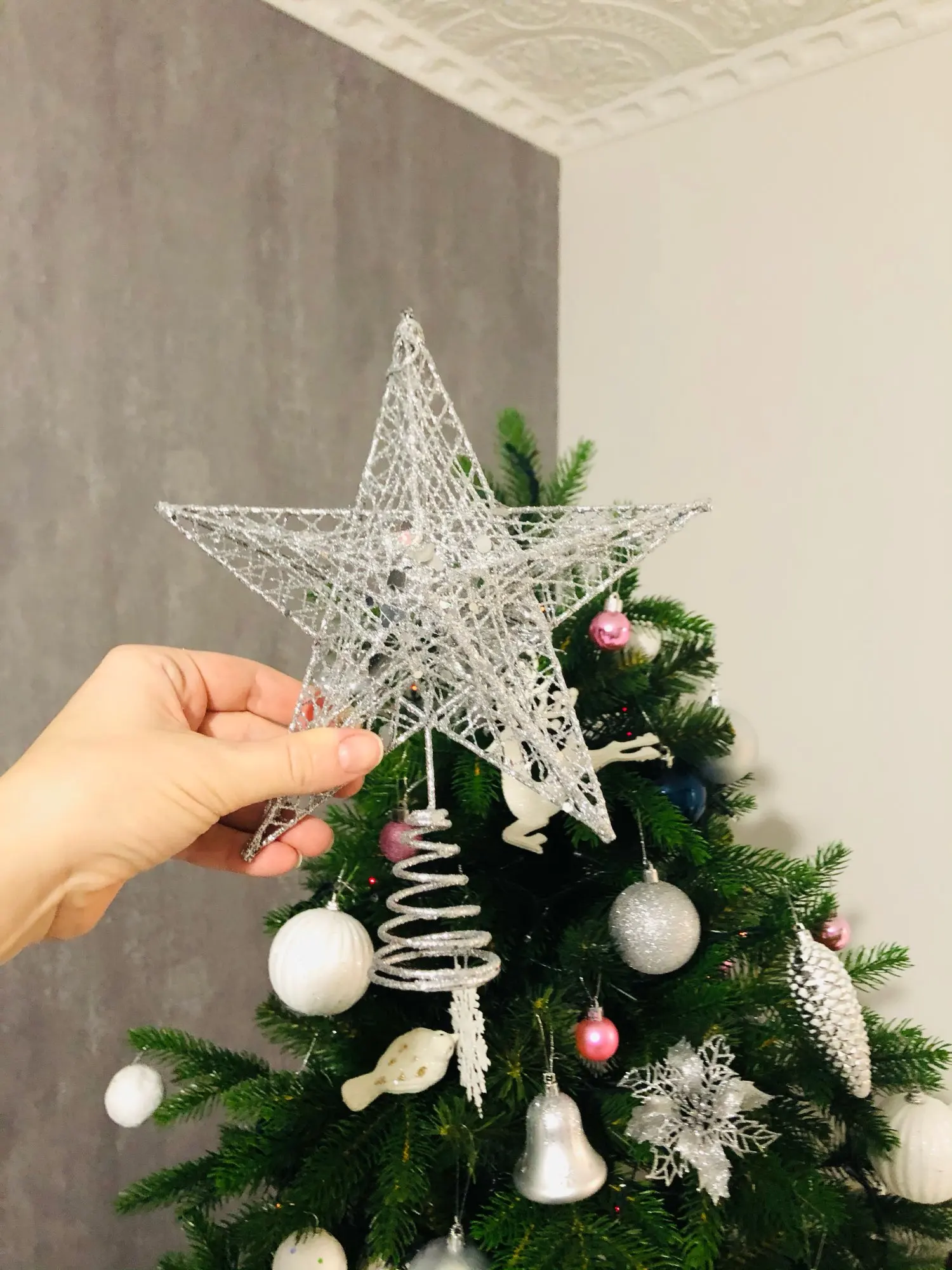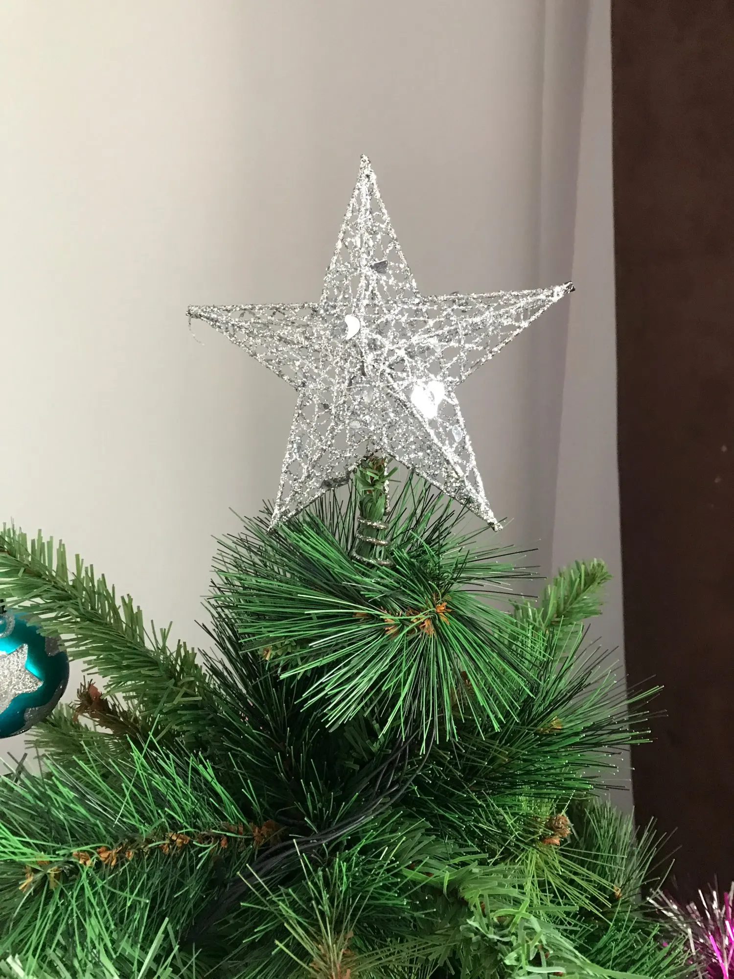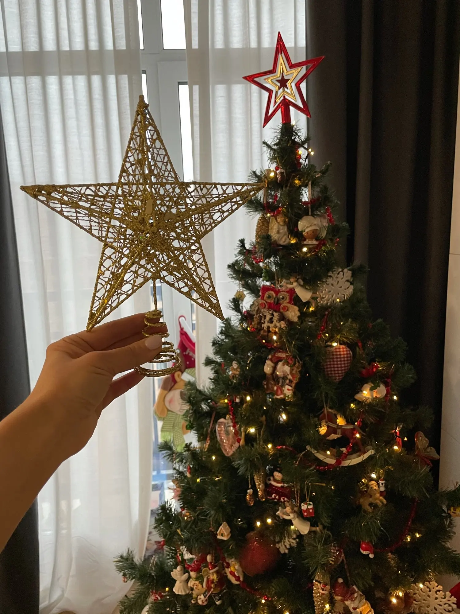 Хорошее украшение. Качественное и крепкое. Даже тяжеловата, макушка моей ёлки не выдерживает. Пришлось установить рядом. Правда Доставка 2 месяца. Заказала 11.11.20, а пришла 11.01.21 - уже после нового года. Пропустила сам праздник. Теперь уже на след. год.