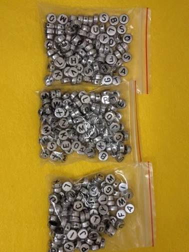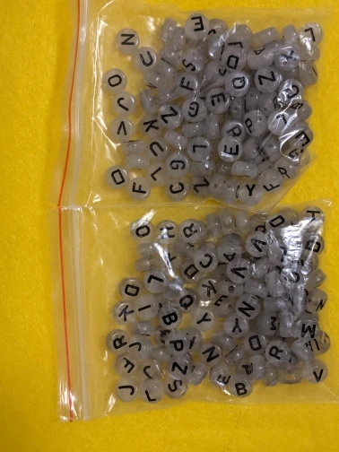 Es como en la foto, vienen letras mezcladas en las bolsas así que viene distinta cantidad de cada una