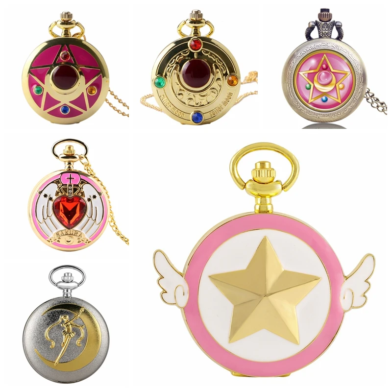 Стразы с изображением сакуры, аниме, японского аниме, звезды, луна, кварцевые карманные часы, модные звезды, женское ожерелье, подвеска, цепочка, подарки