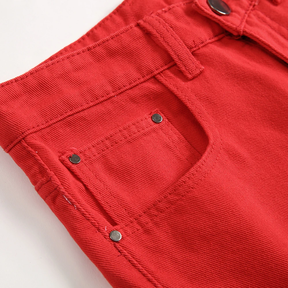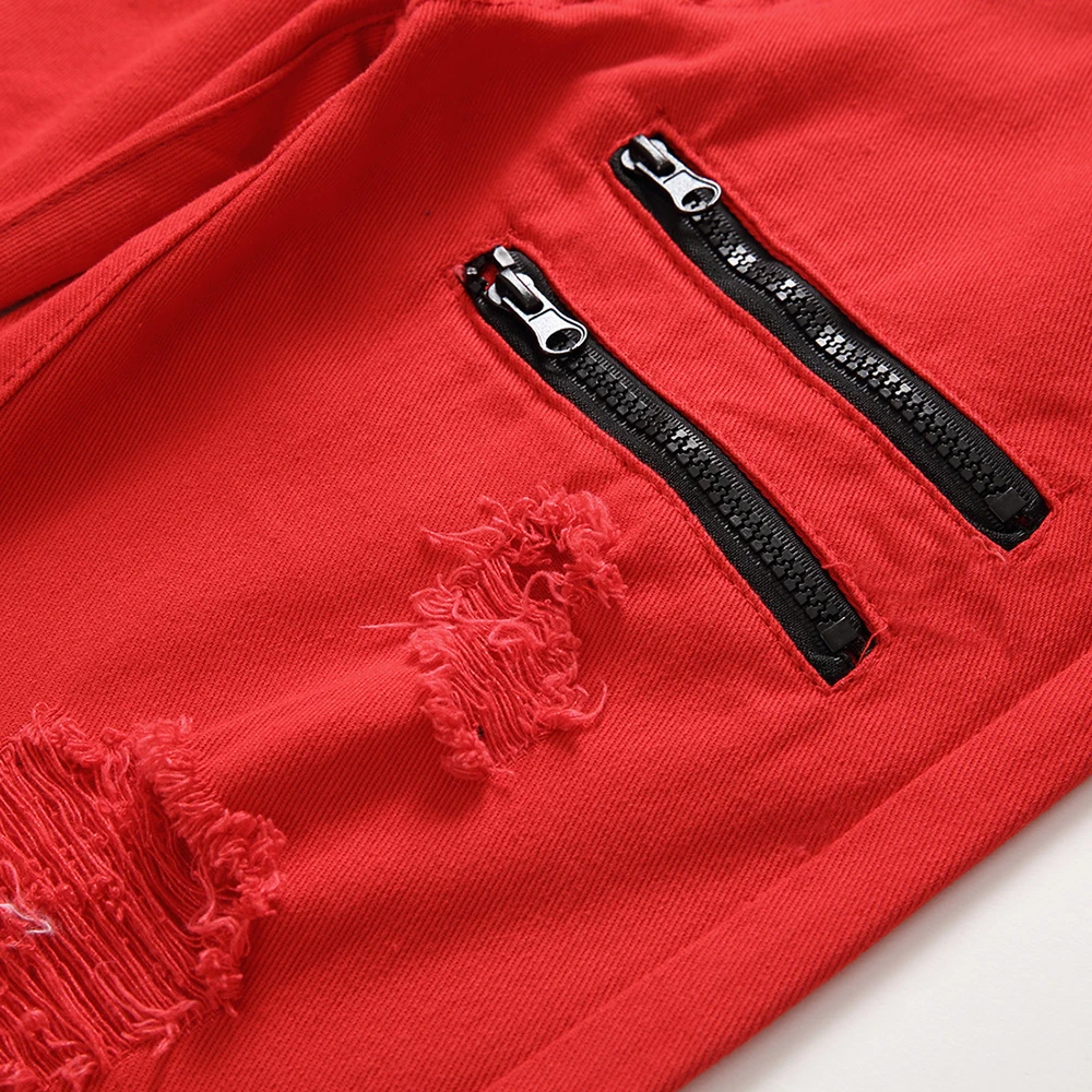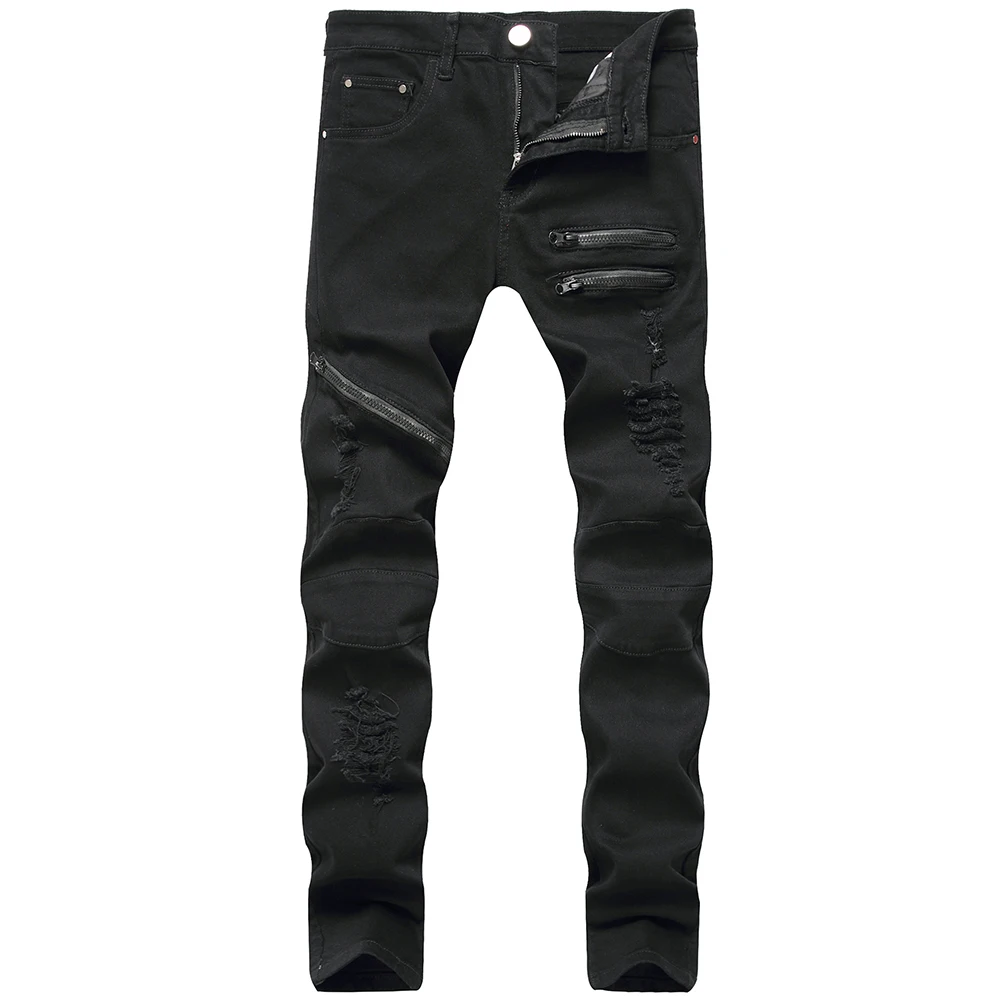 Мужские джинсы на молнии с дырками, рваные Стрейчевые джинсовые брюки, тонкие прямые брюки, белый, черный, красный