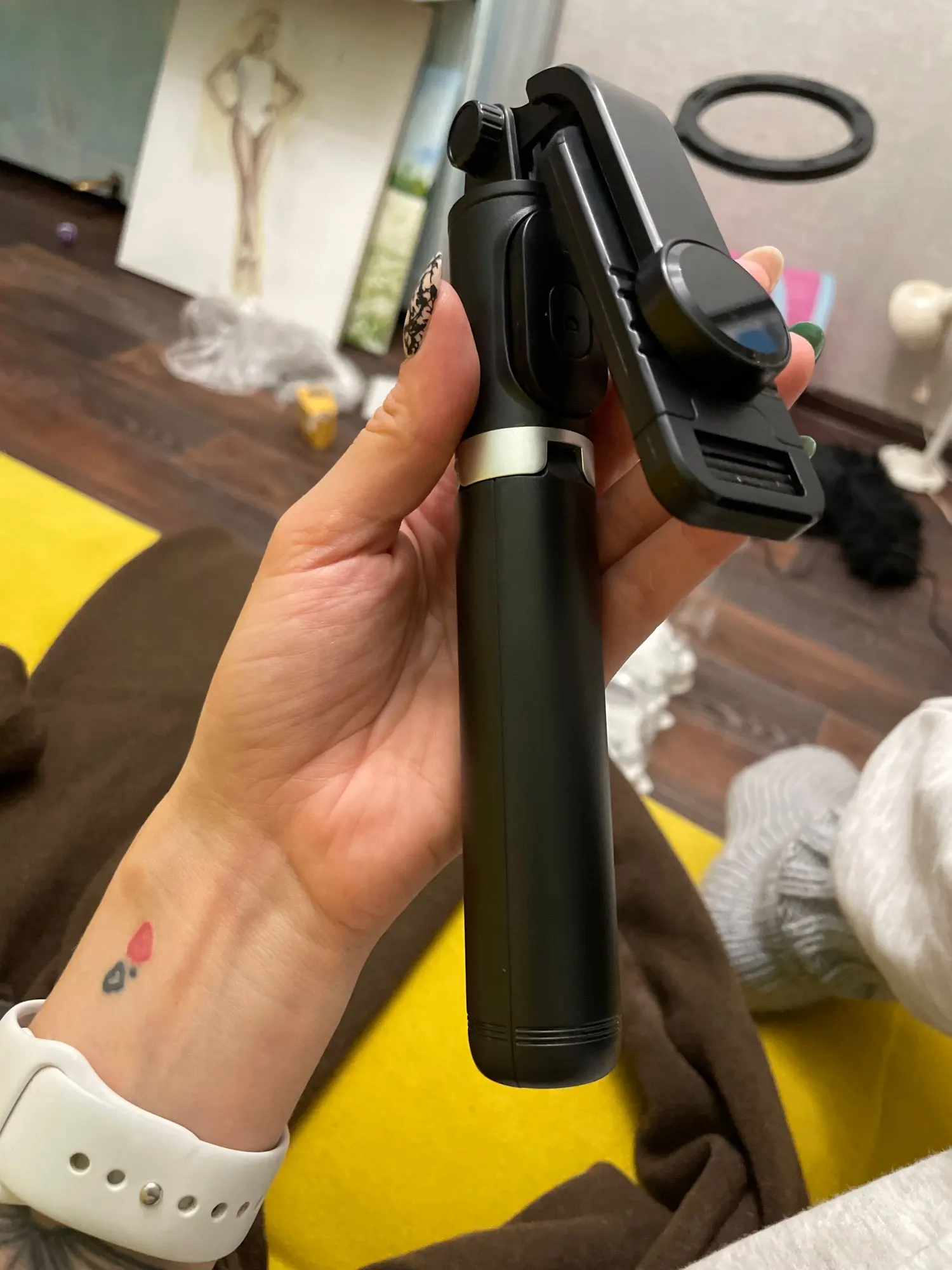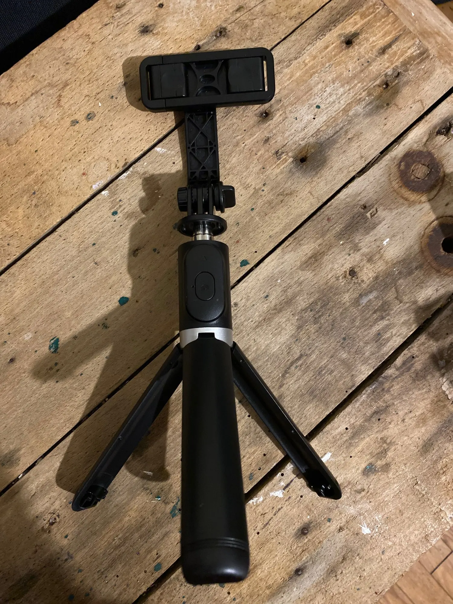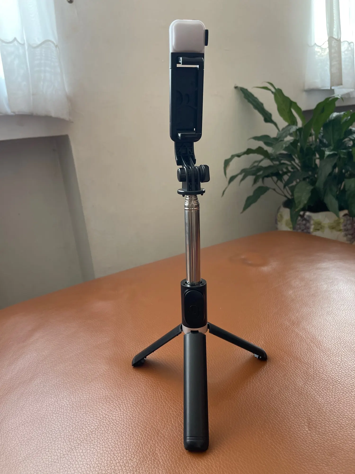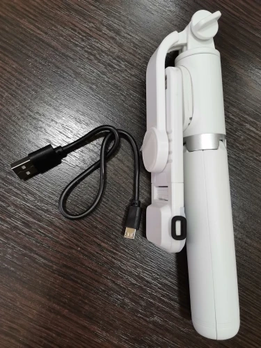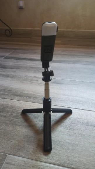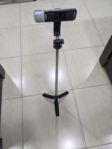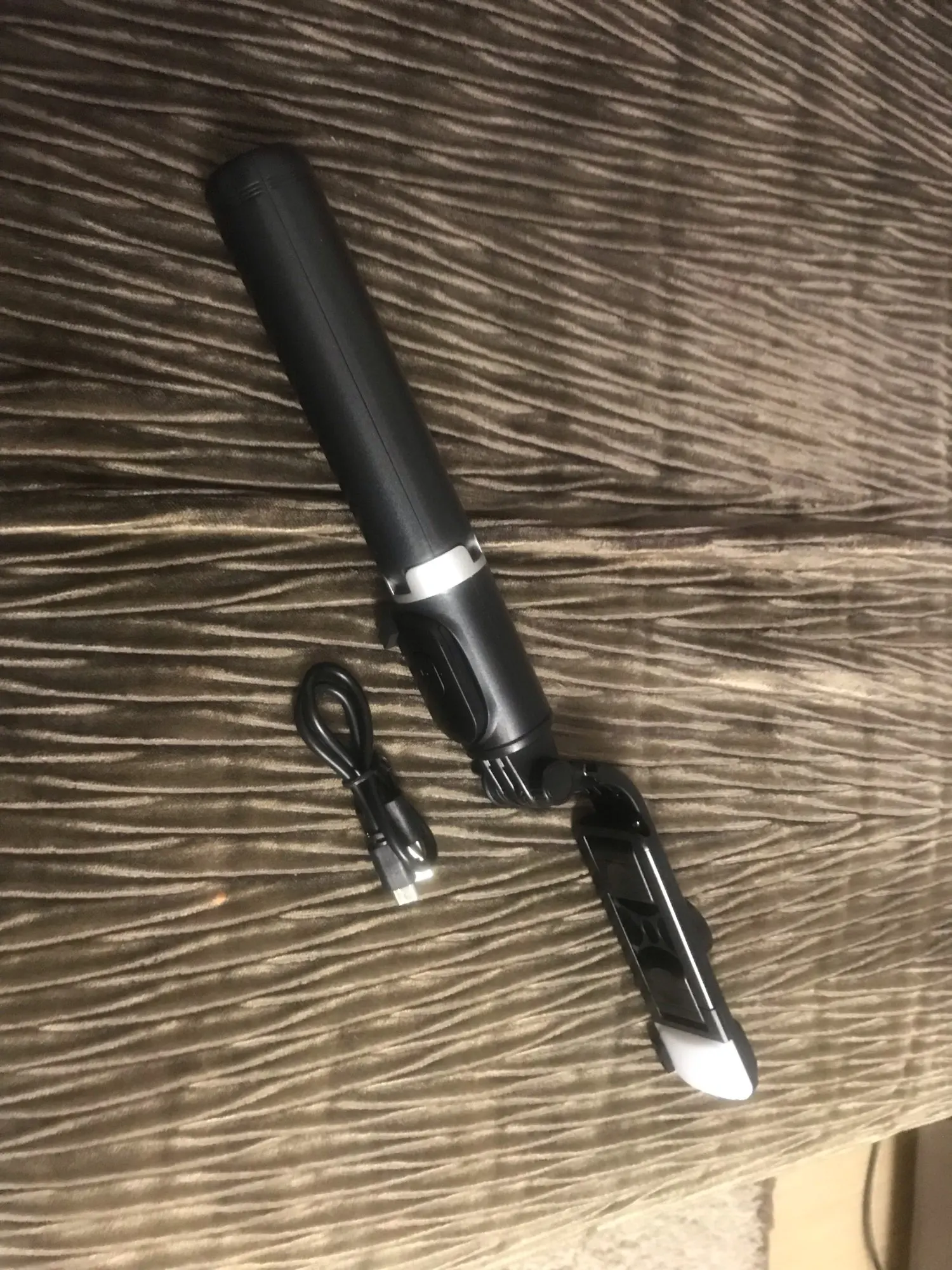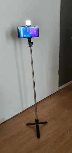 Мини-штатив за свои деньги, просто супер. Качество радует, не хлипкий. Крепежи для телефона прорезинены, так что телефон надежно закреплен. Угол наклона телефона регулируется с помощью бокового винтика. Работает через блютуз, у меня правда не с первого раза конектиться, но я с техникой не очень на Ты. Плюс кнопка работает исправно и батарейка идет в комплекте.