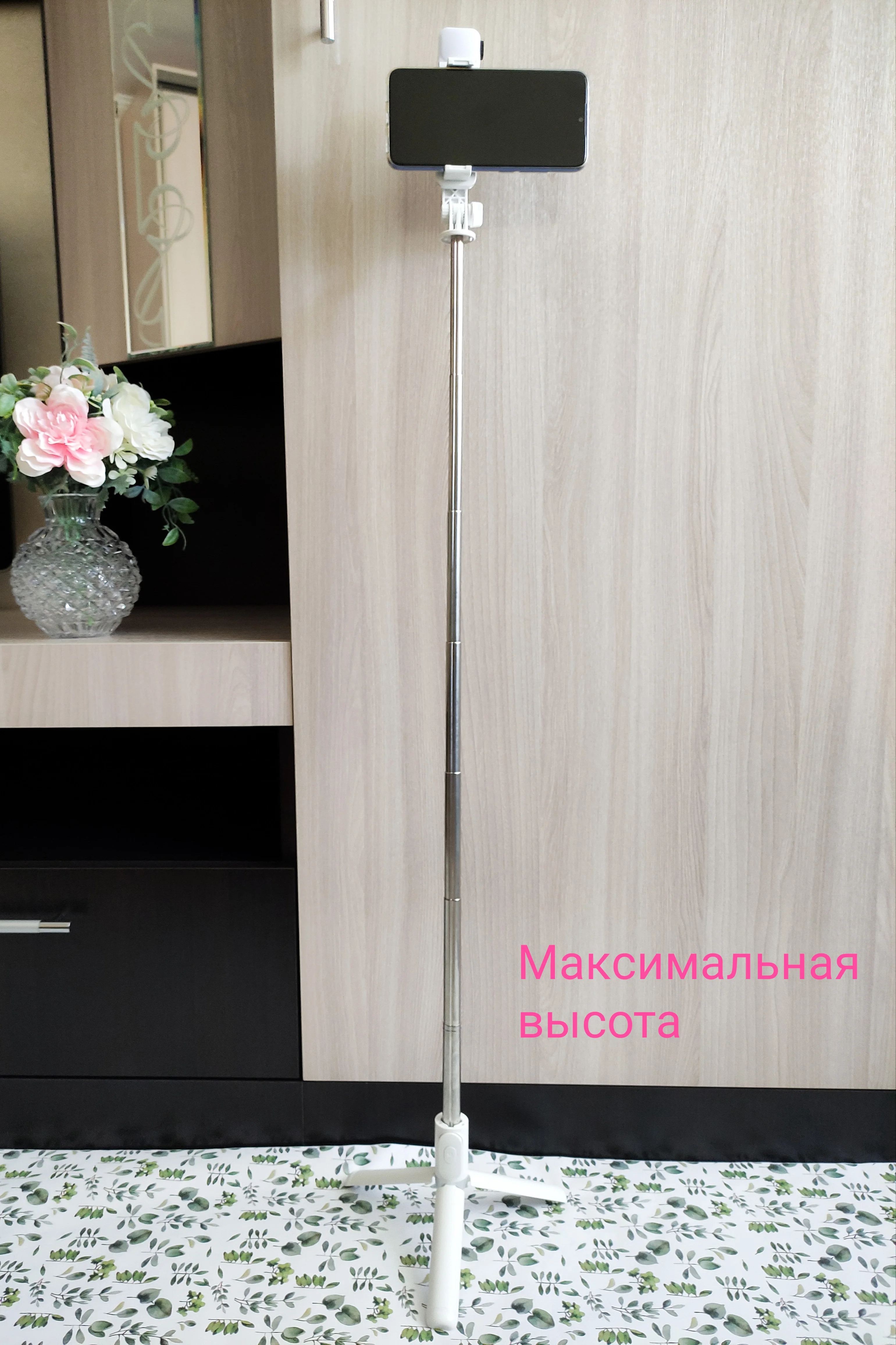 Доставка за 3 недели. Заказывала в подарок, но на исправность сразу проверила. Пультик работает, блютус легко подключается. Батарейка была в комплекте. Свет горит, есть зарядка для него. Конечно, дома можно пользоваться штативом на всю высоту, но где-то на природе, от дуновения ветерка, скорее всего, телефон перевесит и будет грандиозное падение)) А как селфи-палка всё супер: крепко, надёжно.