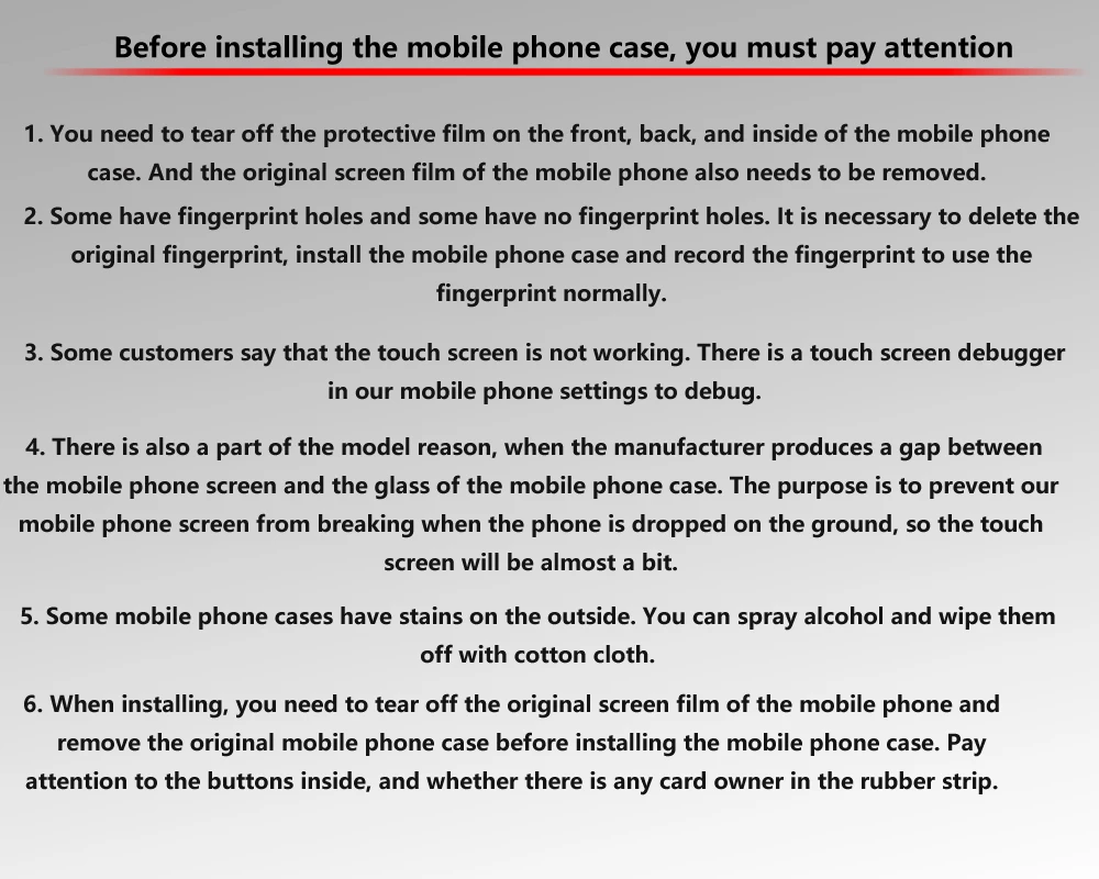 Примечание: поскольку этот мобильный телефон чехол имеет переднее стекло, он уже очень хорошо защищал мобильный телефон, поэтому я предлагаю вам не использовать другие закаленные пленки на его поверхности, потому что это может повлиять на его использование.