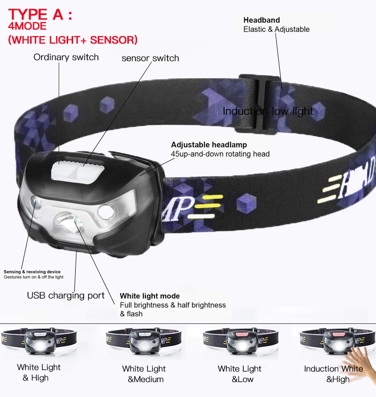 1. Портативный наружный indnctive светильник все-перспективно разработан, порт USB для зарядки добавляет более сильную мощность. Основной светодиодный светильник. 2. Специальная конструкция с двойным переключателем для преобразования режимов. Перезаряжаемая батарея высокой емкости обеспечивает продолжительную мощность для более безопасных видов спорта на открытом воздухе. Фара в основном используется для рыбалки, охоты, ночной ходьбы, пеших прогулок и кемпинга. 3 Индукционная фара для пальцев, когда ваша рука находится рядом с фарой в пределах 15 см, фара включится, когда вы оставите фару пальцем, она будет выключена. 4. Фара содержит аккумулятор. Вы можете зарядить usb-кабель для фары. 5. У него есть два переключателя, один из рутинных переключателей и Индукционная swicth.