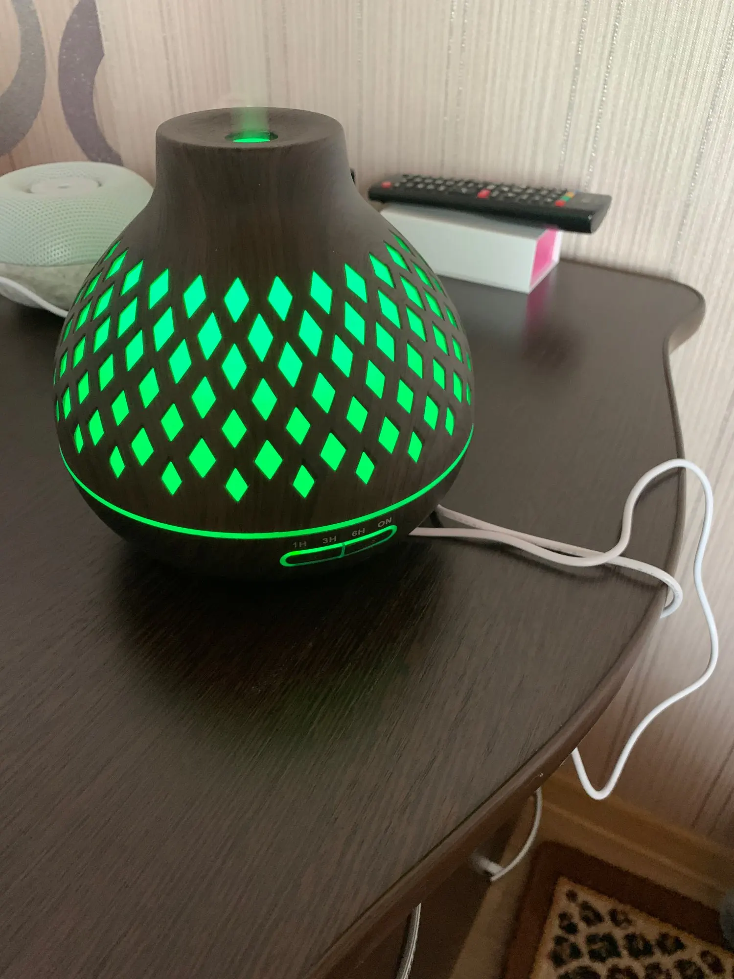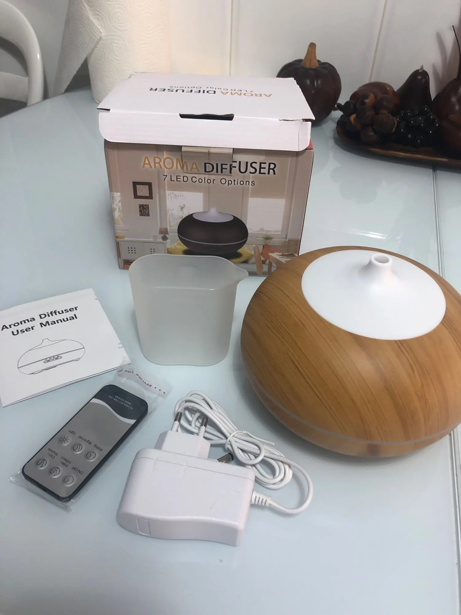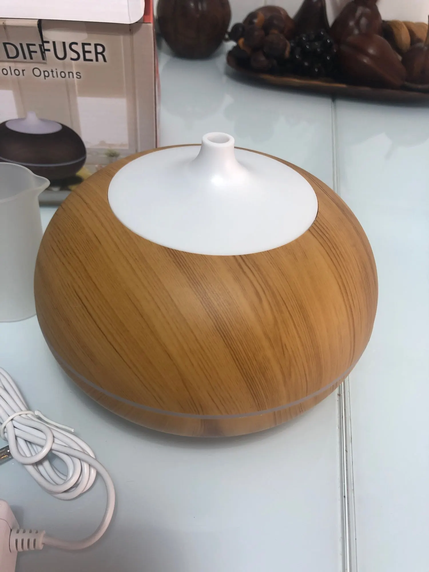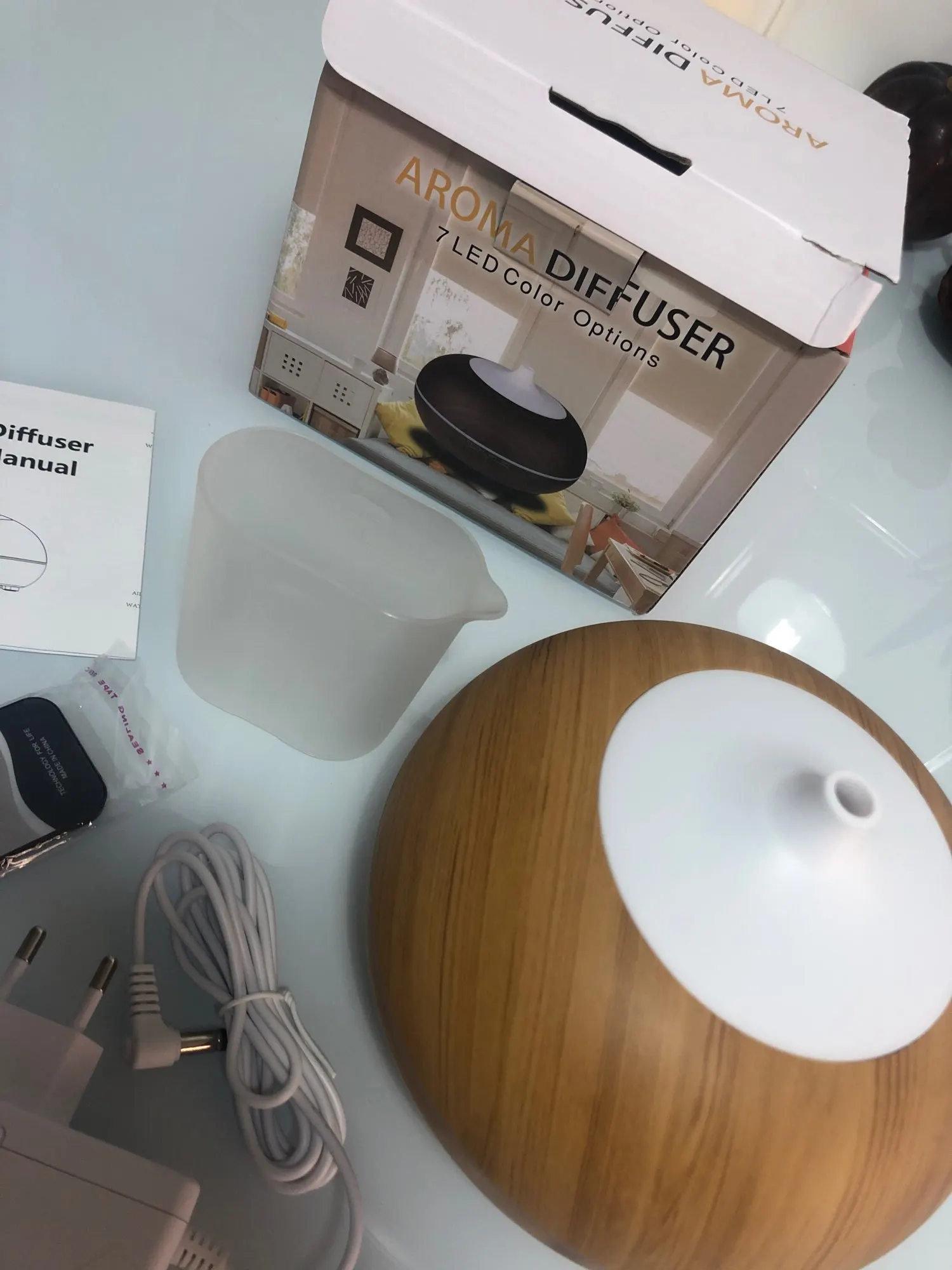 Exellent diffuser. Well made and looks beautifull. The different color light are amazing too. Perfect for the bedroom (and home office). Highly recommended.