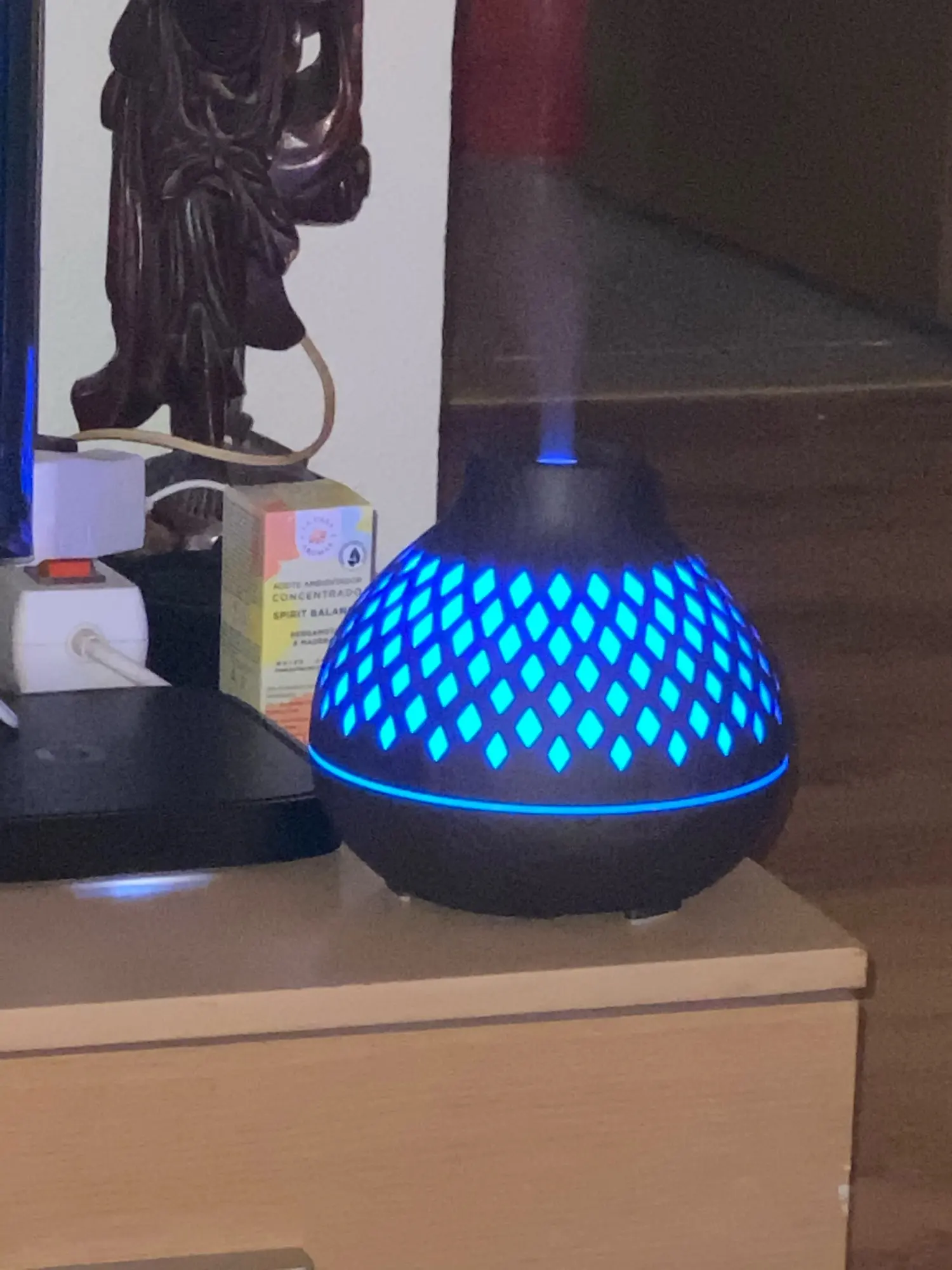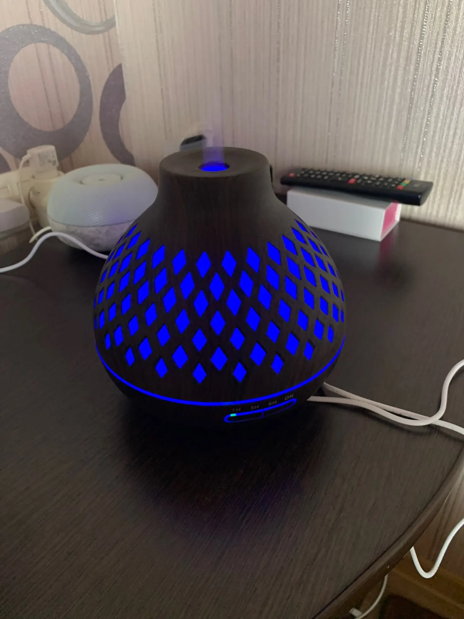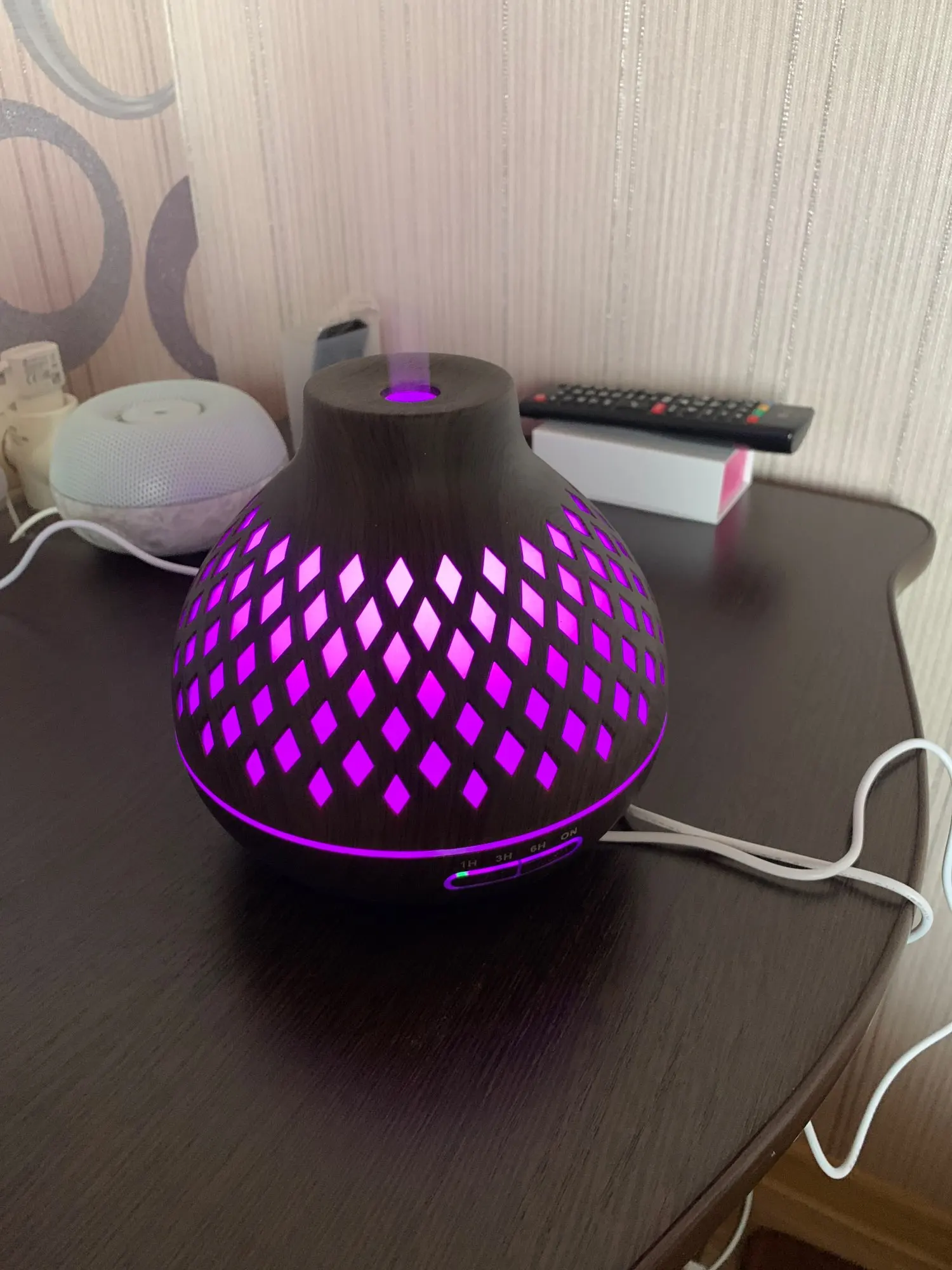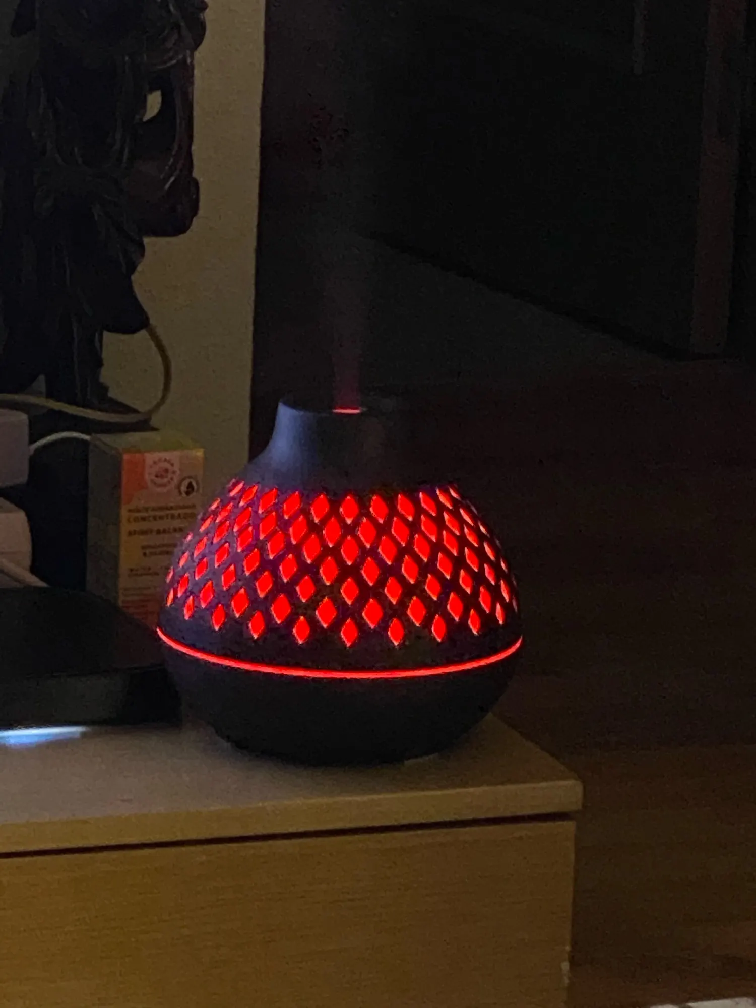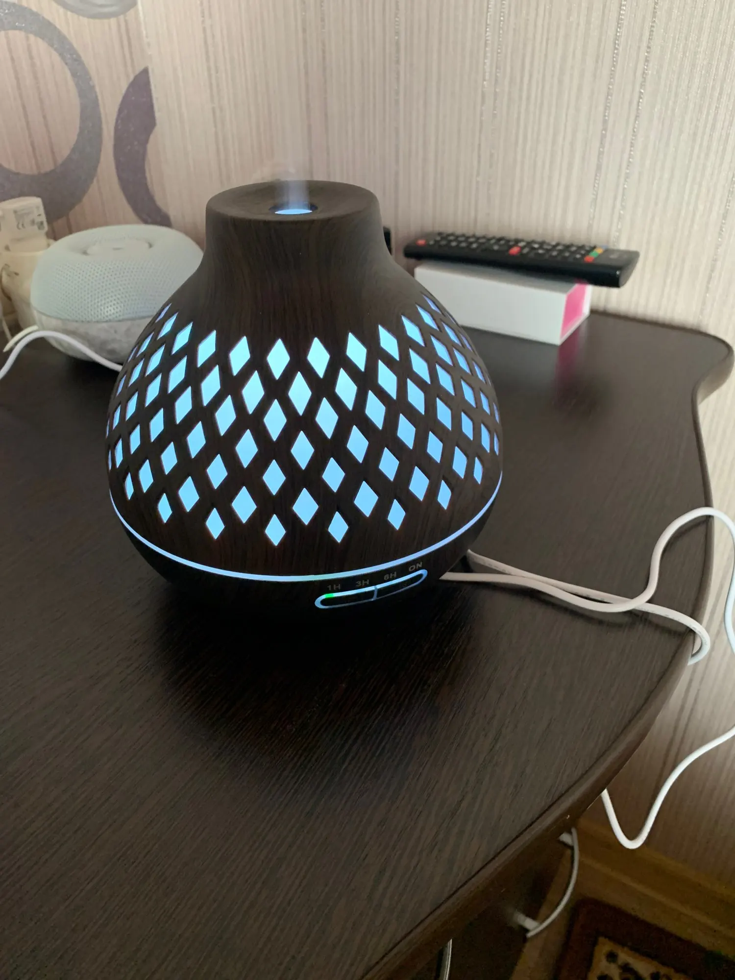 Exellent diffuser. Well made and looks beautifull. The different color light are amazing too. Perfect for the bedroom (and home office). Highly recommended.