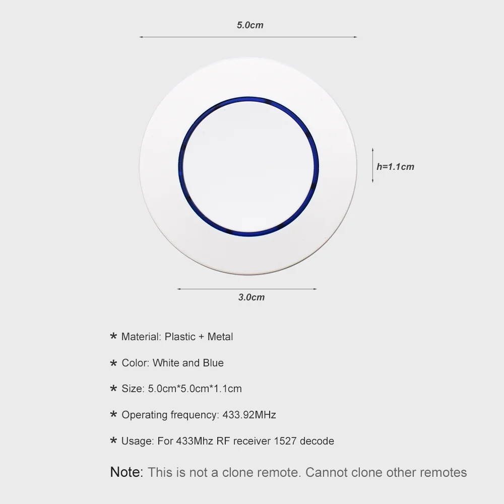 Цвет: белый и синий Рабочее напряжение: 3 в Батарея: CR2016X1 (в комплекте) Рабочая частота: 433 МГц. Кодирующий чип: EV1527 (обучающий код). Количество ключей: 1 Размер: 50 мм * 11 мм Использование: для радиочастотного приемника 433 МГц, декодирование 1527
