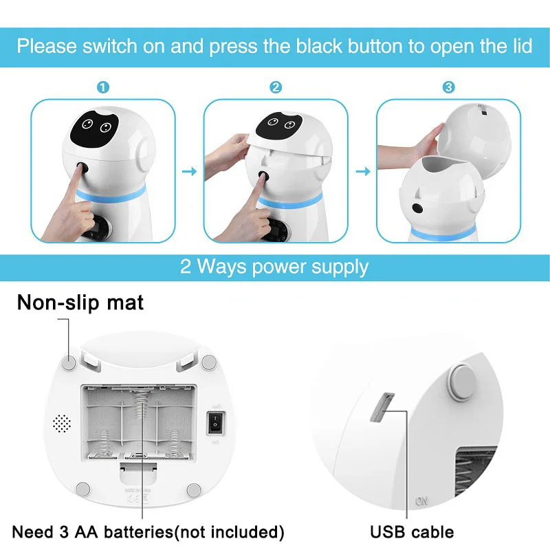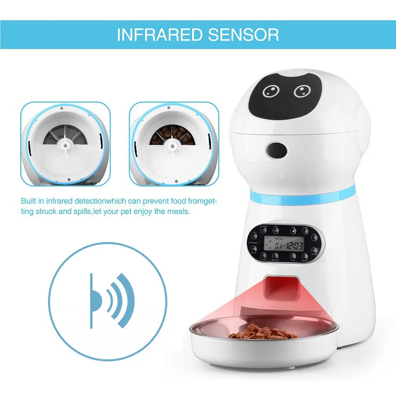 1. Вы можете кормить своего питомца 4 едой в запланированное время 2. Функция голосовой записи помогает вам заботиться о ваших питомцах в любое время. 3. Вы можете записать свой голос менее 10 секунд. 4. Подходит для сухой корм для животных размером менее 12 мм (Сублимация не доступна), 5,5 г на порцию, до 20 порций на еду (= 100 г) 6. Встроенное инфракрасное обнаружение, которое может предотвратить попадание пищи и разливы, позволит вашему питомцу насладиться едой 7. Размер еды составляет около 5g. Вы можете установить размер еды на 1-20 порций в соответствии с вашим питомцем. 8. Режим питания в таблице USB, режим работы батареи требует 3 батарейки AA (не входят в комплект) 9. Чаша изготовлена из высококачественной нержавеющей стали, также она снимается для легкой очистки.