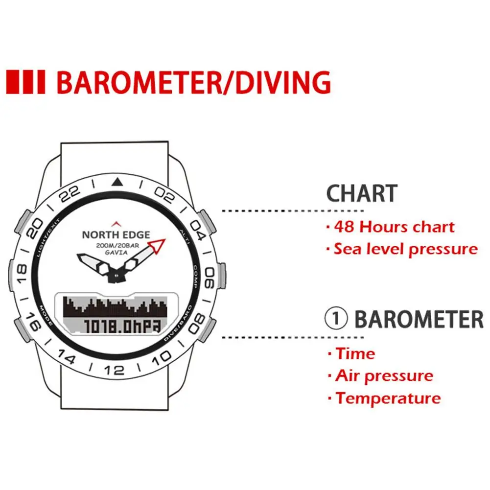 Название бренда: для NORTH EDGEТип изделия: цифровые наручные часыТолщина корпуса: около 15 мм/0,59 дюймаФорма чехла: круглаяШирина ремешка: около 24 мм/0,94 дюймаХарактеристики: Автоматическая Дата, дайвер, компас, секундомер, отображение недели, измерение давления, плавание, высотомер, несколько часовых поясов, водонепроницаемость, светящиеся стрелки, измерение температуры, задний светильникМатериал корпуса: нержавеющая стальДиаметр циферблата: около 47 мм/1,85 дюймаДлина ремешка: около 25 смГлубина водонепроницаемости: 10 барНомер модели: GAVIAМатериал коробочек и чехлов: бумагаМатериал ремешка: нержавеющая стальМатериал циферблата: H ardlexМеханизм: умный, цифровойСтиль: спортивныйТип застежки: Застежка-браслетМаксимальная глубина погружения: около 50 м/164.04ftВодонепроницаемость: около 100 мОсобенности:1. Режим погружения (глубина погружения, время погружения, максимальная глубина погружения 50 м, температура воды)2. Водонепроницаемый 100m328.08ft3. Высотомер4. Барометр (48 часов трендовая таблица давления воздуха)5. Компас6. Термометр (температура)7. Шагомер, счетчик шагов, калории, запись расстояния8. Функции времени: час, минута, секунда, год (2000-2099), месяц, дата, будний день, формат 12 ч/24 ч9. Таймер обратного отсчета (99:59:59 ~ 0)10. Секундомер (0 ~ 99:59:59), 50 наборов данных11. Функции времени в мире (автоматическое переключение времени в летнее время)12. Цифровой компас13. Срок службы батареи14. Подсветка EL