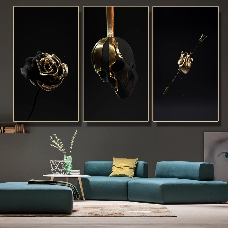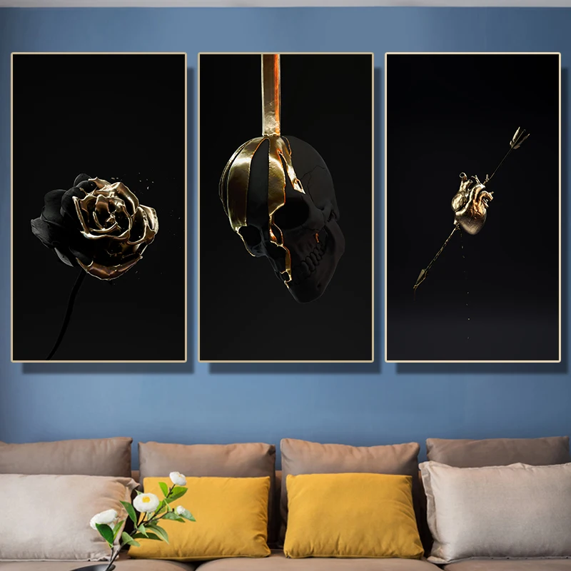 Холст печать плакаты черный и золотой розовый череп, сердце современное искусство живопись Гостиная Hoom Декор HD Европа абстрактная Настенная картина Классическая легкая роскошная прикроватная картина на заказ