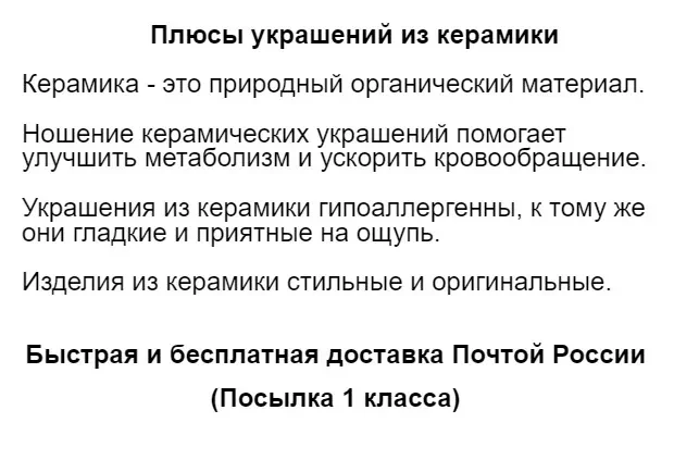 точно соответствует описанию, серьги сделаны очень добротно. Это конечно не серебро, но керамика настоящая, очень довольна, рекомендую, доставка очень быстрая.