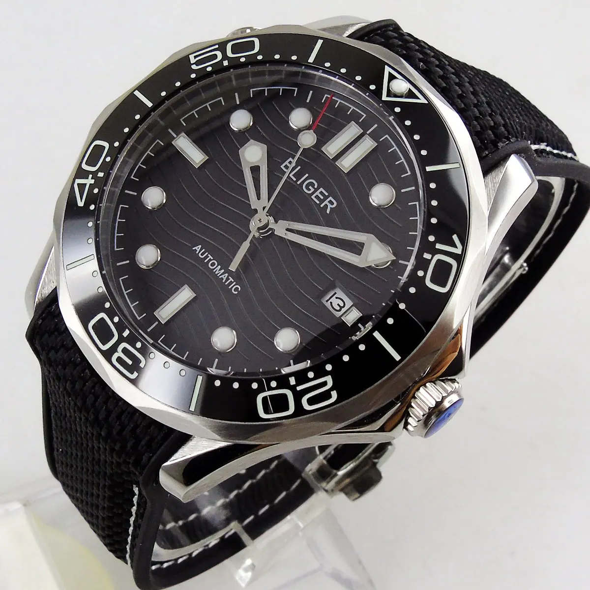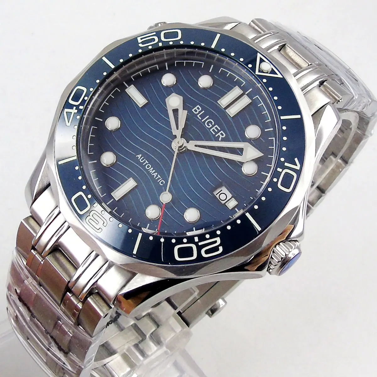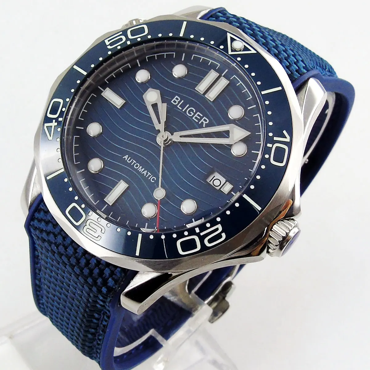 Мужские автоматические часы NH35Miyota8215PT5000 Sapphire, черныйсиний циферблат, резиновыйстальной ремешок, керамическая вращающаяся рамка, Bliger 41 мм