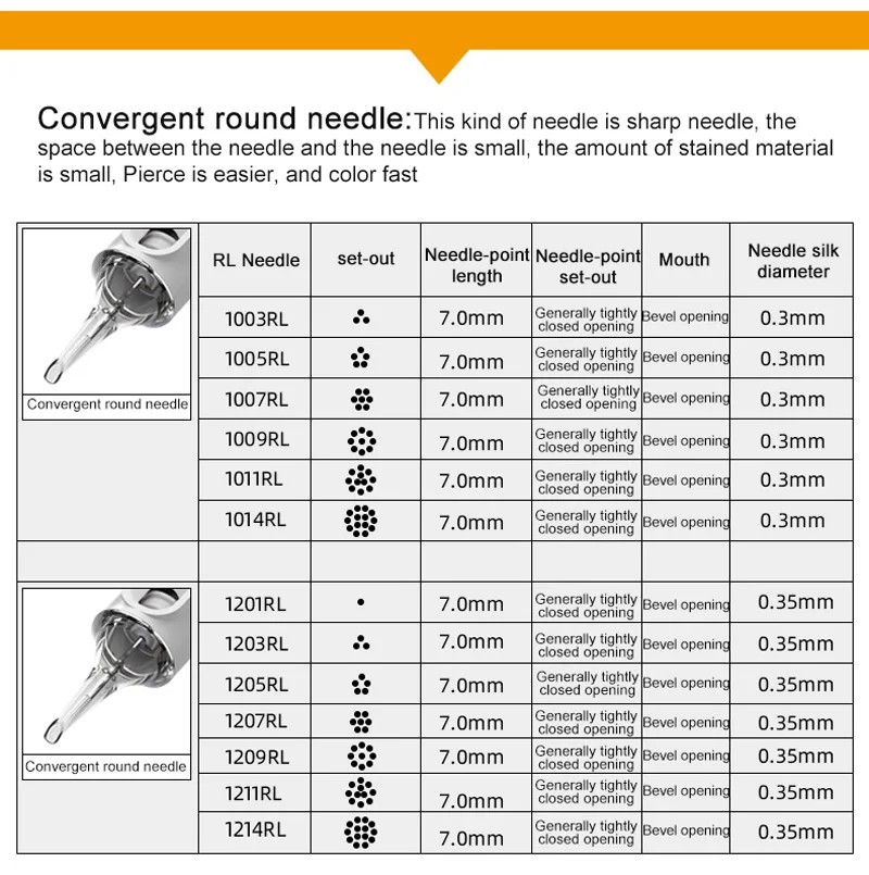 1. Иглы для татуировок изготовлены из точной формы, с низким уровнем шума, это поможет профессиональному татуировщику. Лучше для татуажа2. RL/RM/M1/RS четыре дополнительных типа с несколькими размерами будут соответствовать различным иглы татуировки.3. Более того, одноразовый материал быстро изменяется и обеспечивает идеальную, несложную и гигиеническую работу.