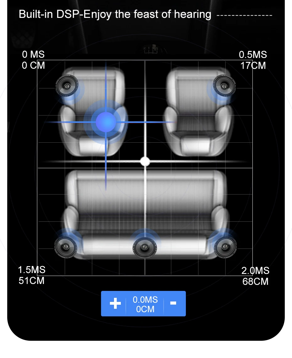 С мощным чипом DSP, поддерживает 32 регулировки эквалайзера и регулировку положения.Настраивает лучший звуковой эффект для путешествия.