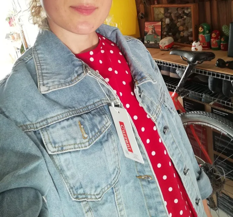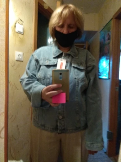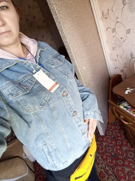 Блииин, какая же она классная, давно хотела и не раз заказывала, но они не оправдали мои ожидания, это самый удачный крой, даже нижняя пуговица застегнулась и наверху куртка не надулась пузырем, как в других. Вообщем я довольна покупкой!!! размер выбирала по таблице, у меня об груди 95-100, размер L сел как надо, спасибо большое) материал джинс хб, пришла куртка быстро.