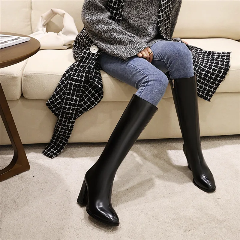 Женские сапоги до колена из ПУ кожи, с острым носком