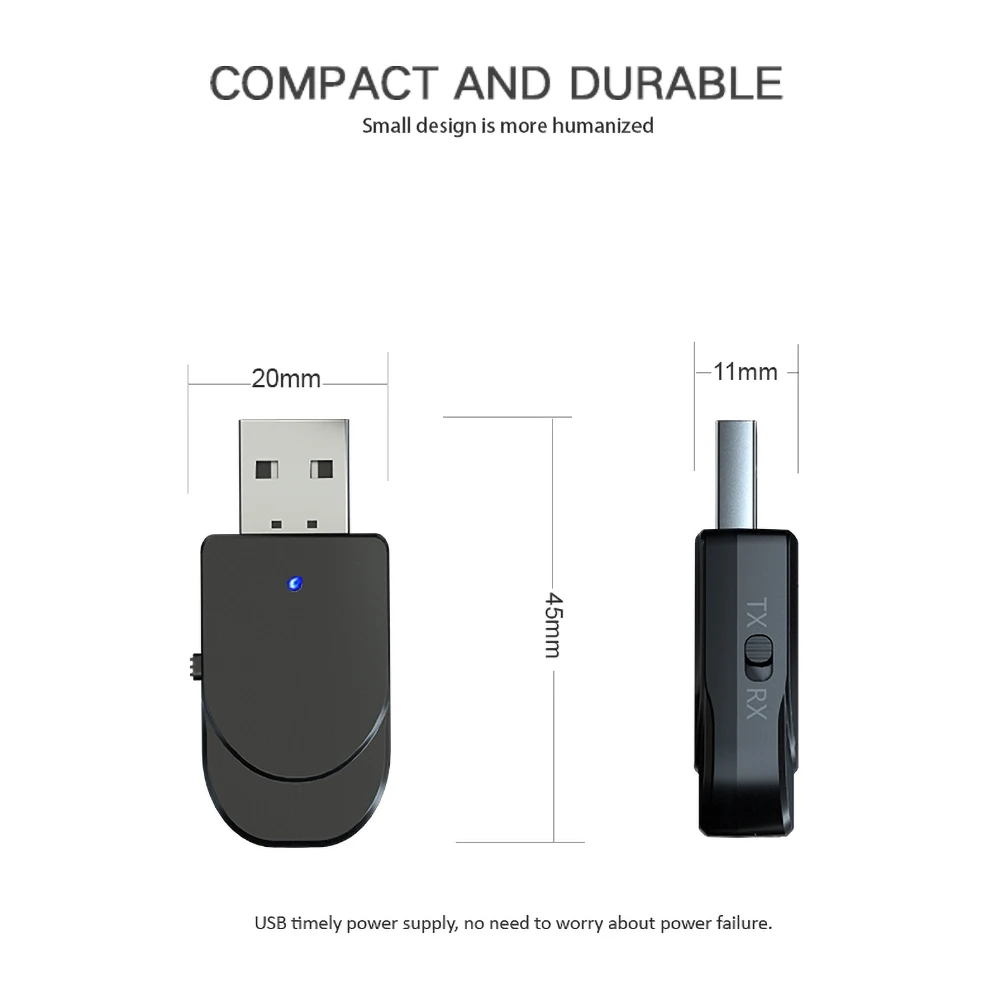 2. 3,5 мм аудио Bluetooth передатчик режим:Для телевизора, ПК, проектора, передачи звука на bluetooth-динамик или наушники.3.USB аудио Bluetooth Звуковая карта:Подключите его к ПК или ТВ, подключи и играй, ПК или ТВ может передачи аудио bluetooth наушники/динамик. Не нужно подключать 3,5 мм аудио-кабель.Технические характеристикиМодель: KN330Технологии: BT5.0, A2DP, AVRCP (только режим приемника)Рабочий диапазон: до 10 м/33 футов (без каких-либо блокирующих объектов)Имя сопряжения (режим приемника): KN330/M135 TX: режим передатчика, красный светодиодный светильник включенRX: режим приемника, синий светодиодный светильник включенРазмеры: 45 мм * 20 мм * 11 ммПосылка:1x Bluetooth 5,0 аудио передатчик/приемник адаптер1x3,5 мм Aux кабель1x Руководство пользователяОсобенности:1. Этот беспроводной аудио передатчик и приемник портативный и легко носить с собой. Он может идеально использовать беспроводное аудио решение для каждой ситуации и приложения.2. Режим передатчика: беспроводное переключение звука с телевизора без Bluetooth, домашней стереосистемы или CD-плеера на bluetooth-гарнитуру или динамик.Компьютера и ТВ аудио передатчик режим: беспроводной передачи аудио с вашего компьютера или ТВ на bluetooth-гарнитуру или динамик (через USB порт, не нужно использовать 3,5 мм аудио-кабель).3. Режим приемника: Беспроводная передача аудио с телефона с поддержкой Bluetooth, планшета или компьютера на кабель стерео, колонки или наушники.4. Переключение режима:Используйте переключатель TX/RX для переключения режимов.5. Метод сопряжения-Режим RX: имя сопряжения: KN330/M135 . Найдите KN330/M135 В настройках Bluetooth телефона, который вы хотите подключить. Синий светильник мигает во время процесса сопряжения, и синий светильник перестает мигать после успешного сопряжения. Подключите устройство к аудиоустройство с помощью 3,5 аудио кабель.-Режим TX: режим TX автоматически ищет другие устройства приема Bluetooth (такие как bluetooth-гарнитура, bluetooth-динамик, bluetooth-приемник и т. д.). При сопряжении красный светильник мигает при поиске устройства, и красный светильник перестает мигать, когда сопряжение успешно. Подключите устройство к устройству, таких как ТВ с 3,5 аудио кабель/RCA аудио кабель.-Используйте режим TX на ПК и телевизоре: Подключите USB к usb-порту компьютера и автоматически найдите другие устройства приема Bluetooth (например, bluetooth-гарнитура, bluetooth-динамик, bluetooth-приемник, И т. д.). При сопряжении красный светильник мигает, красный светильник перестает мигать.6. Мини Портативный Аудио потоковый источник питанияВ KN330 Компактный, но имеет мощные возможности беспроводной передачи аудио. Поместите этот передатчик и приемник в рюкзак или сумку для ноутбука и легко переносите его с собой.7. Совместимость с большим количеством устройств: 3,5 мм кабель (в комплекте в посылка) может быть широко использован в компьютеру, ноутбуку, домашней стереосистеме, наушники, смарт-телефоны, MP3 cd-проигрыватели, и т. д.