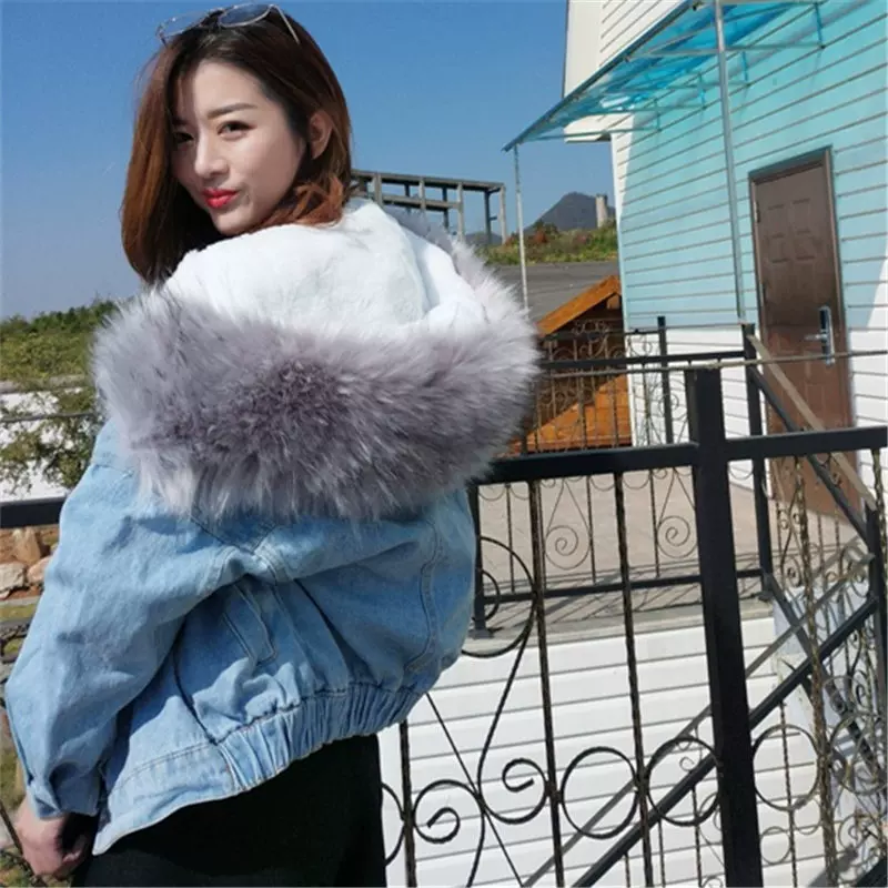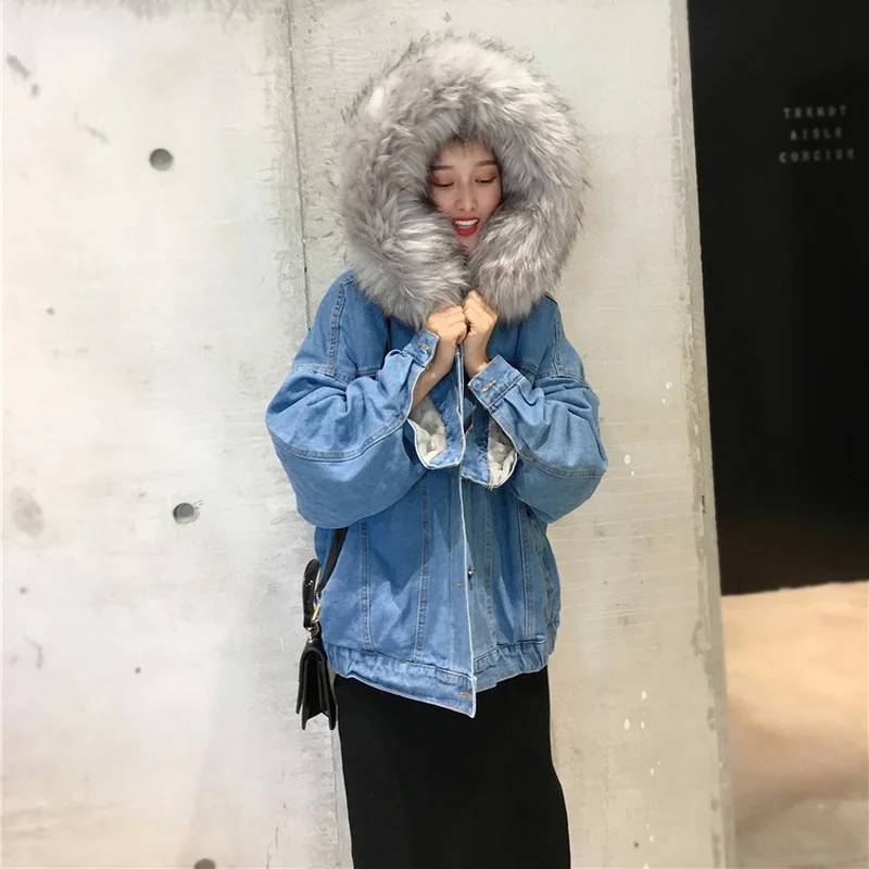 Женская джинсовая куртка с большим меховым воротником, зимнее барха...
